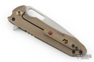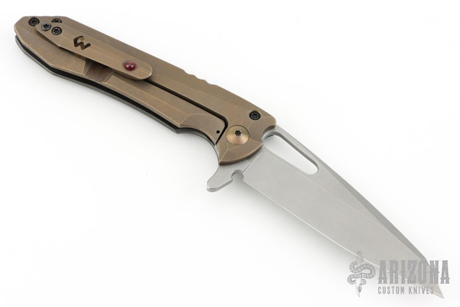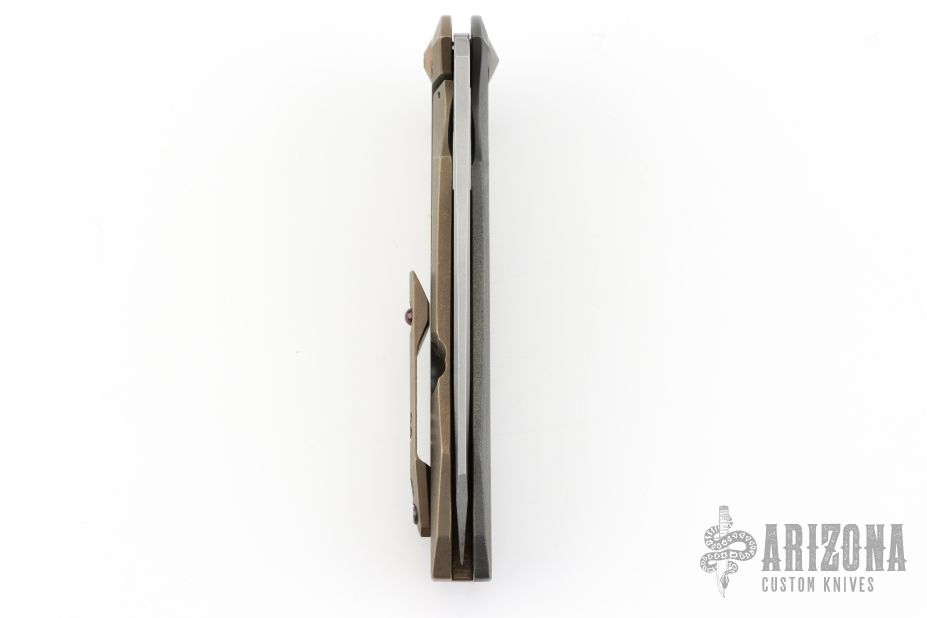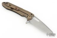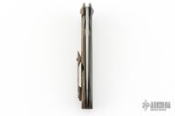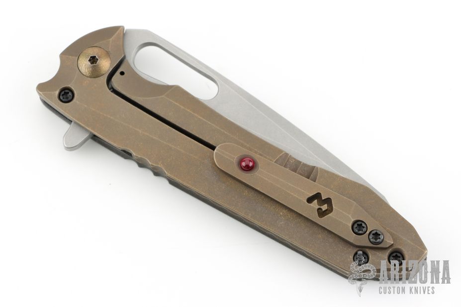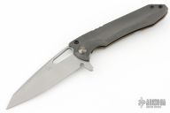 This Mako framelock flipper from Gavko Knives features a tumble finished blade with thumbhole and flipper. The handle has an orange peel finished zirconium front scale, tumbled and anodized titanium frame and backsapcer, tip up anodized and tumbled titanium clip. The backspacer and spine of the knife has milled fullers. Comes with zipper case, patch and keychain. Nice detent, lockup and blade seating. Excellent condition.