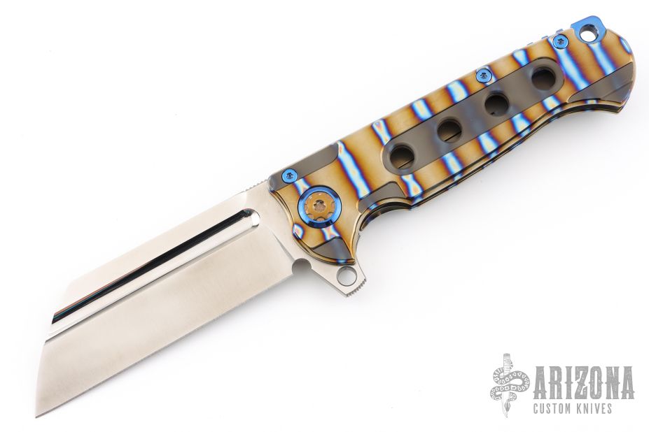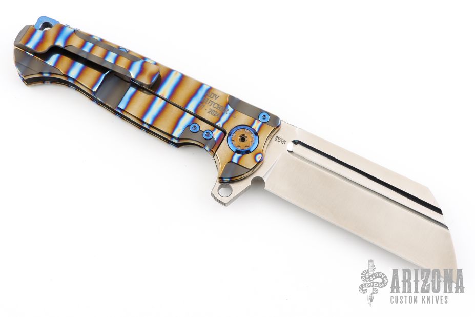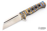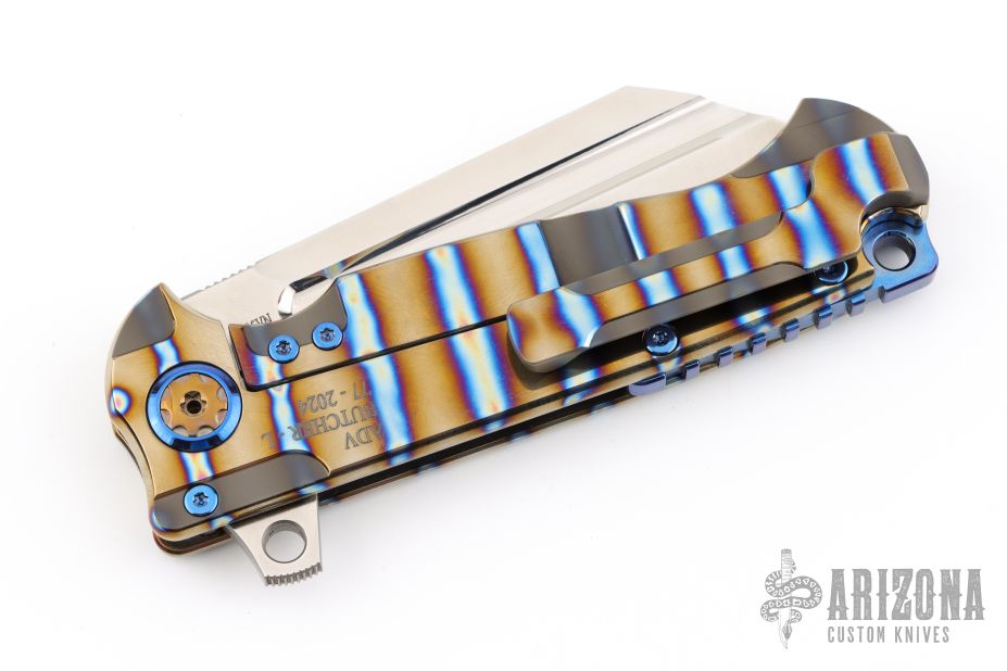 This ADV Butcher framelock flipper has a satin finished blade with false top edge, fullers and notched thumbrest and flipper. Has a flame anodized titanium frame, blue anodized titanium backspacer, and a flame anodized titanium tip up clip. Nice detent, lockup and blade seating. Comes with a nylon zippered case. Has a couple of light scratches, otherwise excellent condition.