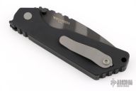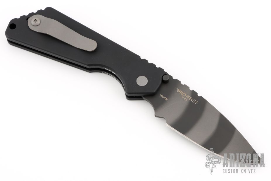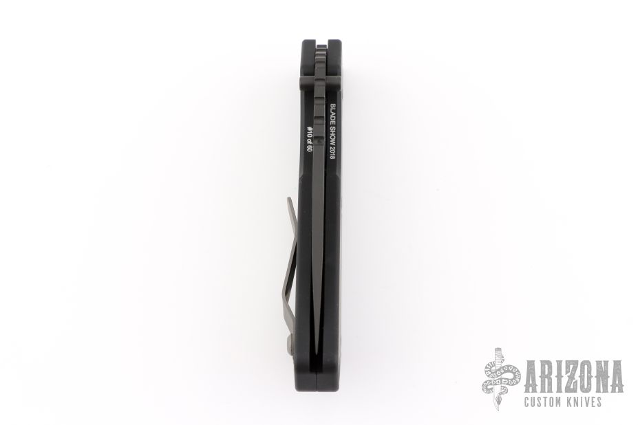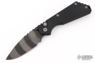This Pro-Strider SNG by Pro-Tech and Strider Knives features a tiger stripe blade with notched thumbrest. The handle has a black aluminum frame with blasted hardware and blasted stainless steel tip up clip. Comes with original box and papers. #10 of 60 from Blade Show 2018. Has a couple light scuffs, otherwise Excellent condition.