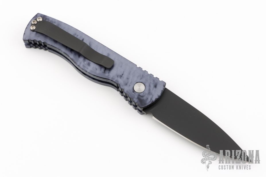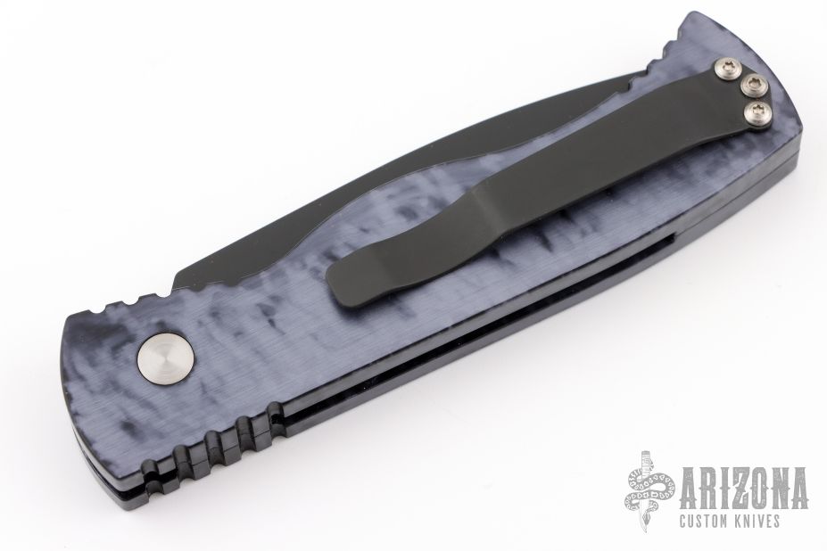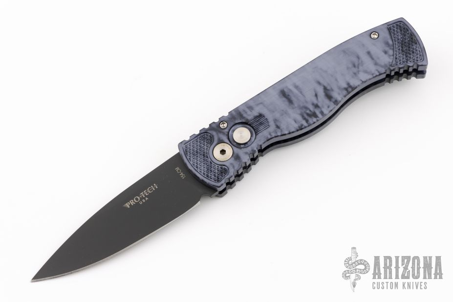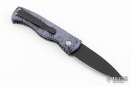 This TR-2.1 Side Opening Auto from Pro-Tech Knives has a black finished drop/spear point blade. The handle is grey and black Jazz anodized aluminum with black stainless steel tip up clip. Comes with original box, and papers. Has a couple light scuffs, excellent condition otherwise.