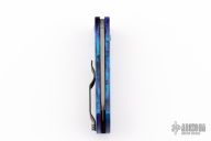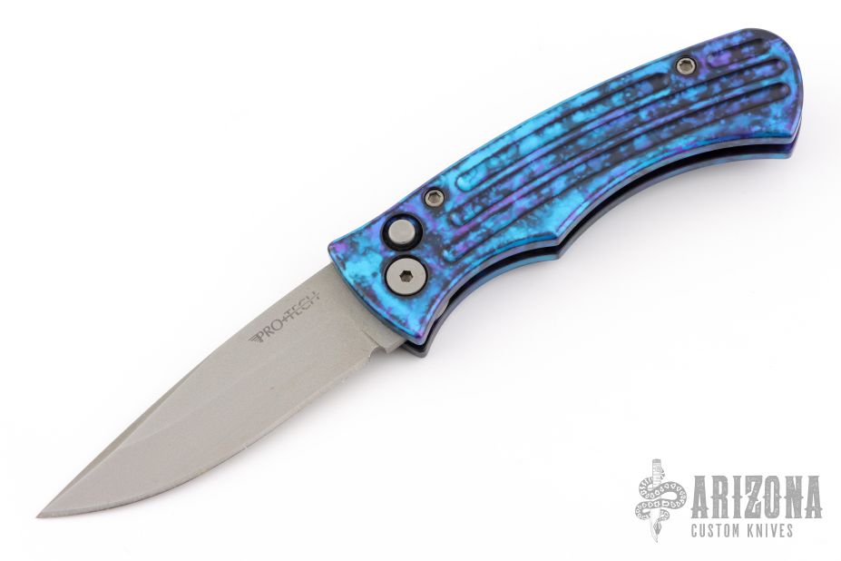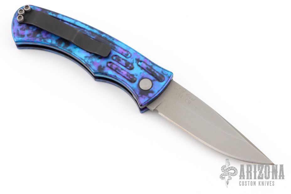 This Duke by Pro-tech features a bead blast finished drop point blade. The handle is blue/purple Jazz anodized aluminum with black tip up clip. Bead blast finished push button. Comes in an unlabeled green Protech box, that has "DUKE" written on one end in silver sharpie. There are some scuffs, scratches, and a couple dings in the frame. Great condition otherwise. Blade is signed on the B-side, "WR Clark".