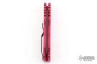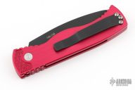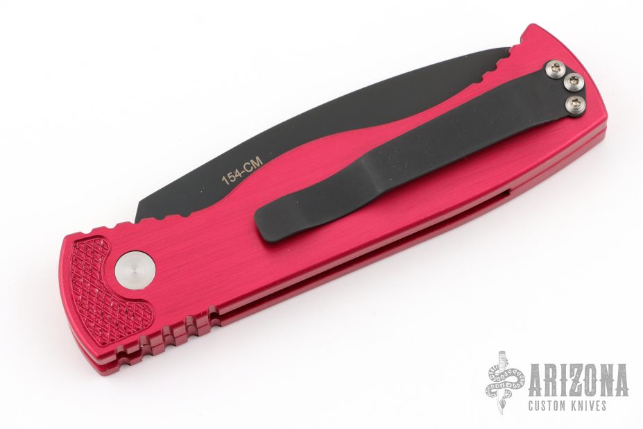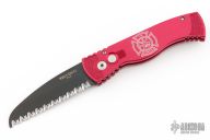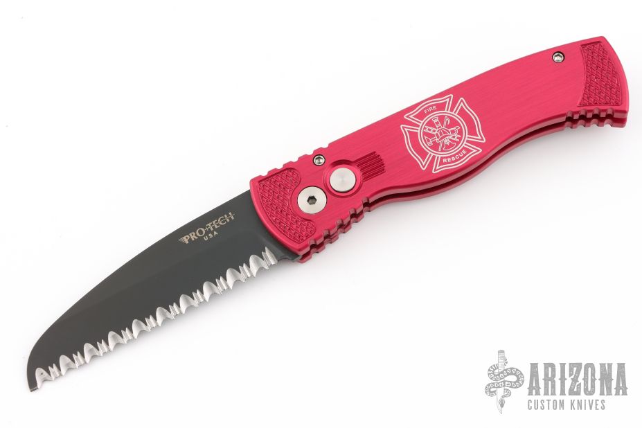 This Rescue Response side-opening automatic features a black finish Rescue-style blade with a fully serrated edge, and a red aluminum handle. Black stainless clip. Coil spring. Comes with original box and papers. Excellent condition.