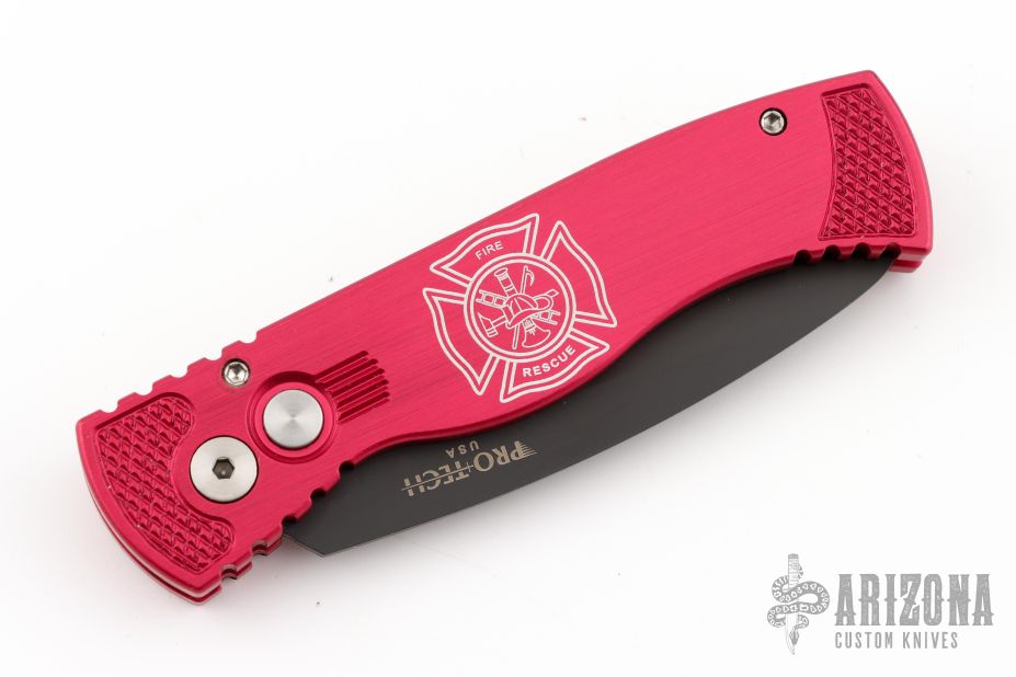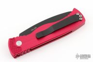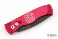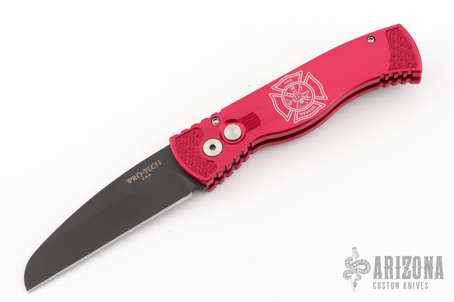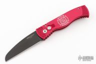 This Rescue Response side-opening automatic features a black finish Rescue-style blade with a plain edge, and a red aluminum handle. Black stainless clip. Coil spring. Comes with original box and papers. Excellent condition.
