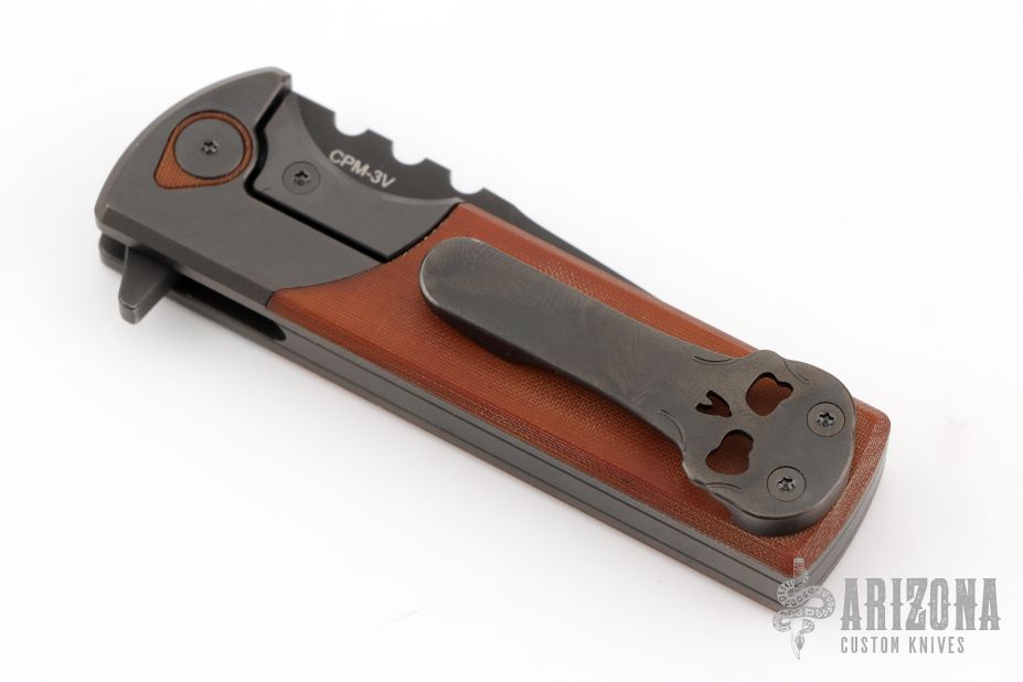 This Chaves T.A.K. features a black blade with the Chaves logo and a notched thumbrest. The handle has an integral titanium frame with natural linen micarta scales, and a black skull pocket clip. Includes the original box and a plain titanium pocket clip. Excellent condition.