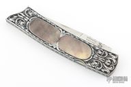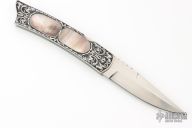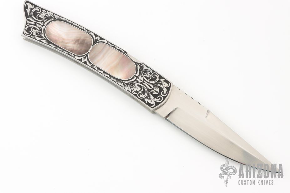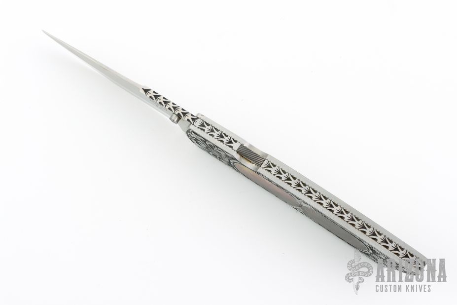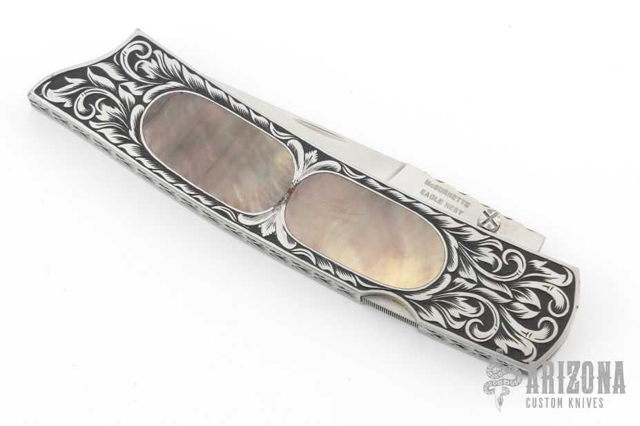 This interframe lockback by Harvey Otis McBurnette features a hand rub satin finished blade with nail nick, fileworked spine and a single fileworked thumbstud. The handle has an engraved stainless steel frame with black lip pearl inlays, fileworked stainless steel backspacer. Has a couple light scratches and a couple of small dings on the edges of the frame, otherwise excellent condition.