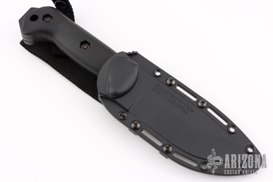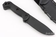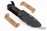 This BK-2 from Becker Knife & Tool features a black coated drop point blade, .260" blade stock and 1.660" blade depth, full tang construction. The handle is comprised of black scales over full tang construction with lanyard hole in pommel. Incudes kydex sheath, custom natural canvas micarta scales and original packaging. Excellent condition.