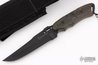 This knife by Browning features a black blade with notched thumbrest, .252" blade stock and 1.464" blade depth, full tang construction. The handle has green/black linen micarta scales with white liners. Comes with a black nylon sheath and original box and papers. Has some spots of epoxy or something on the scales, otherwise excellent condition.