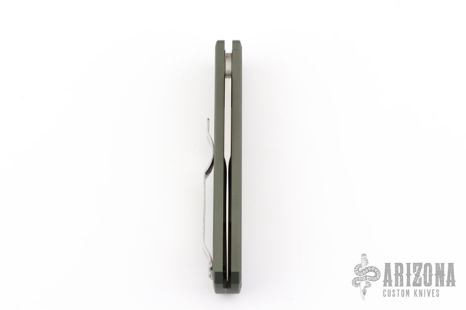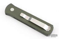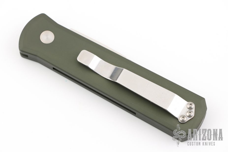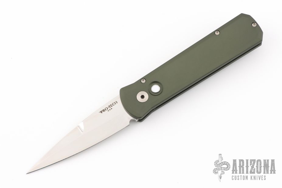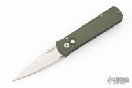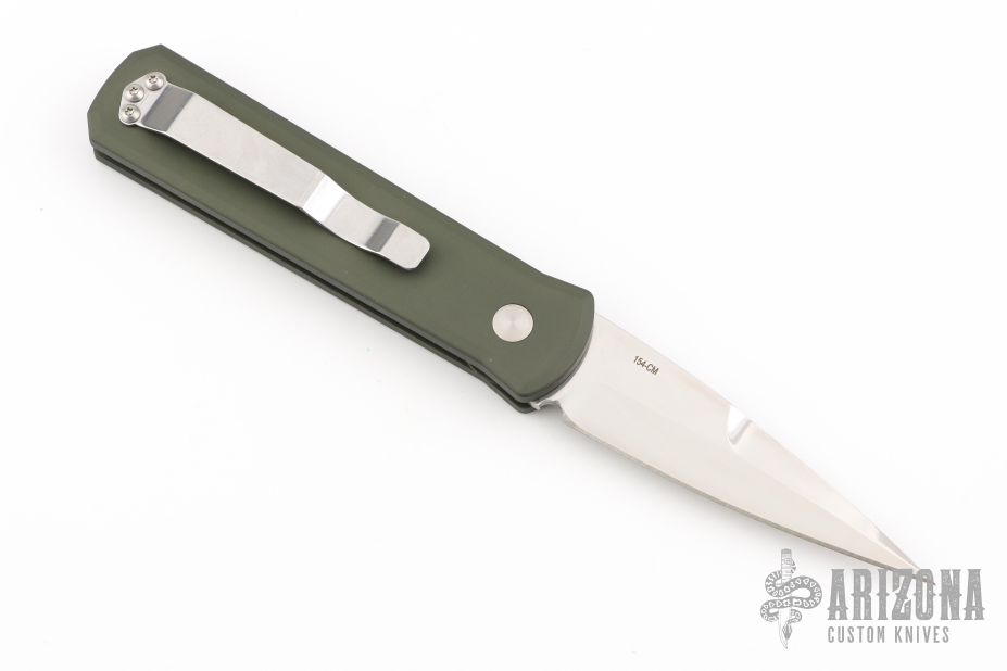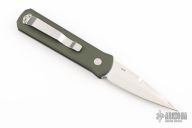 This Godson from Pro-Tech Knives features a mirror finished blade. The handle has a dark green aluminum frame with mirror stainless steel tip up clip. Pearl inlaid button. Comes with original box and papers. Excellent condition.