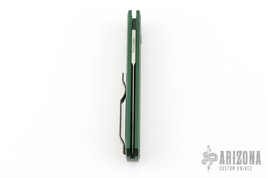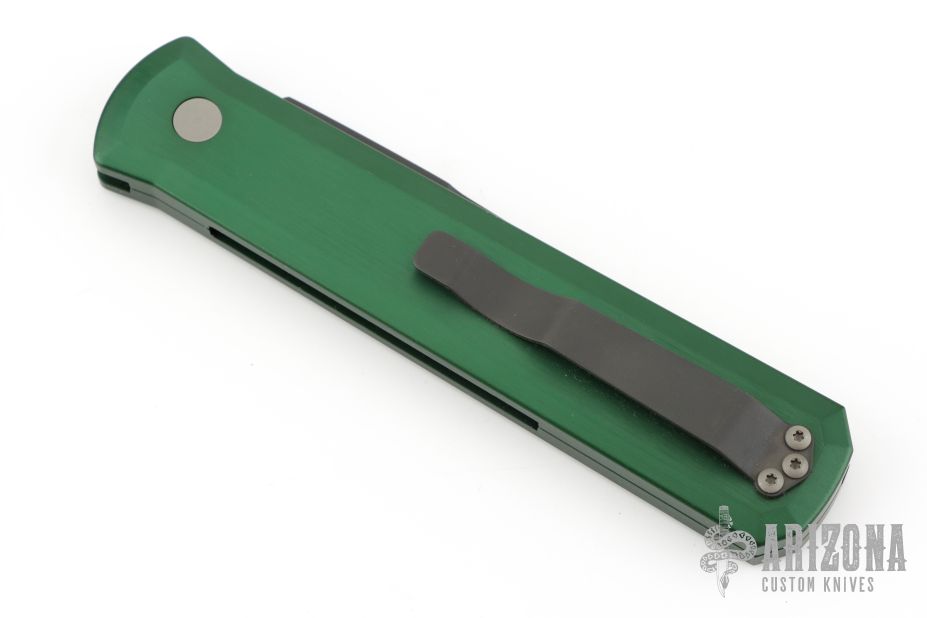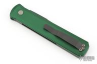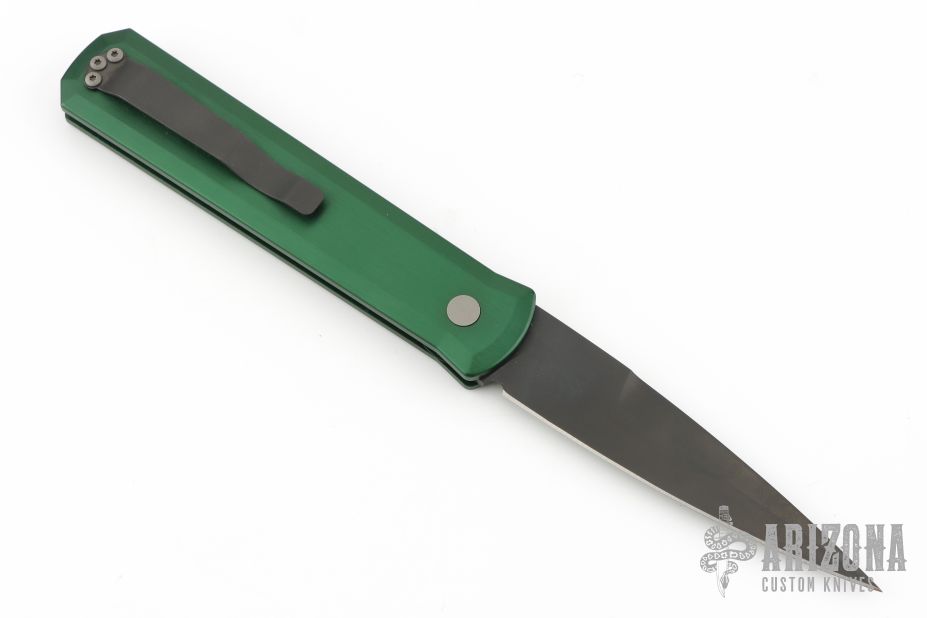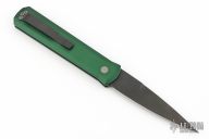 This Godfather features a black dagger style blade (Pro-Tech logo on the blade spine).  The handle has a green aluminum frame with bead blast finshed hardware, push button and black stainless steel tip up clip.  Comes with original box and papers. Has a couple light scuffs, otherwise excellent condition.