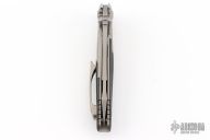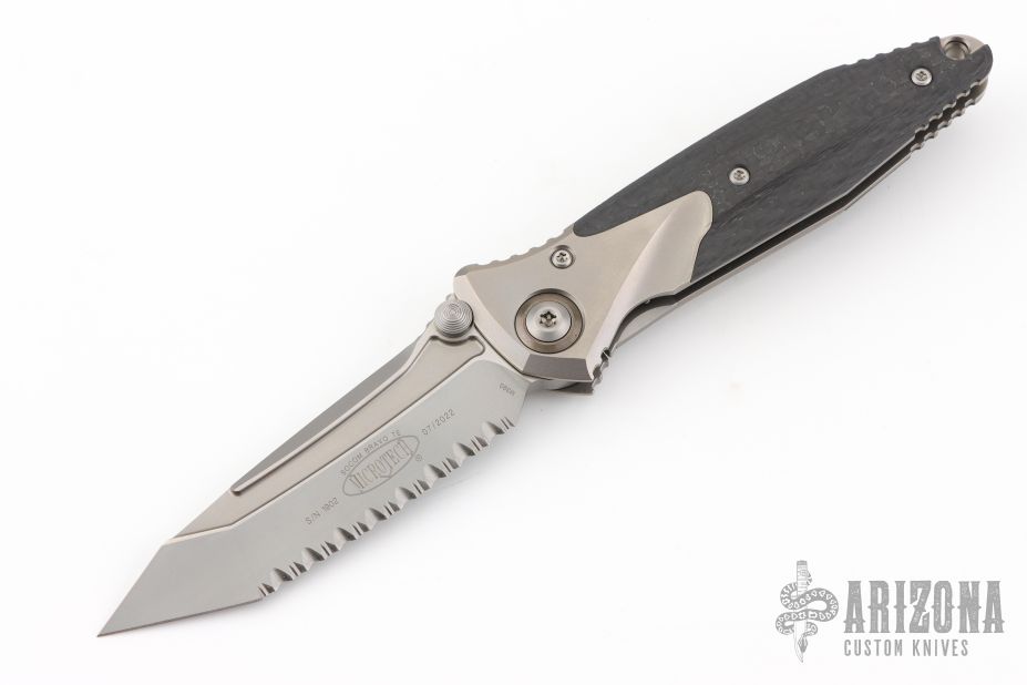 This Socom Bravo by Microtech is made in China by Rike Knife, it features a bead blasted blade with a fully serrated edge, notched thumbrest, and dual thumbstuds. The handle has bead blasted titanium bolsters/liners, anodized pivot collars, carbon fiber scales. Tip up carry bead blasted titanium clip. Bead blasted titanium backspacer. Dated 07/2022 and s/n 1902. Comes with original box. Excellent condition.