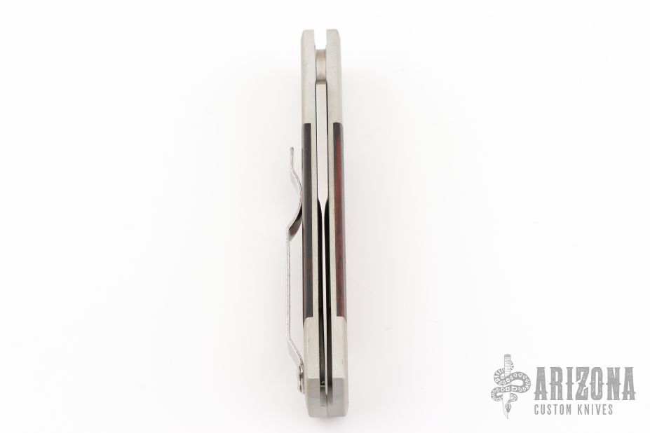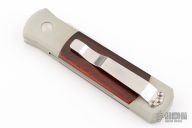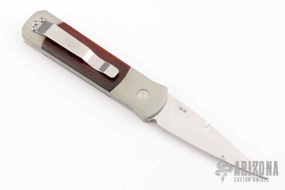 The Godson by Protech is a slightly smaller version of the Godfather. As with all Pro-Tech automatics, the most prominent functional feature is the great spring action. The handles are bead blast finished, and the presentation cocobolo inlays fit perfectly. Mosaic pin inlaid push button. The silver frame and wood covers come together to make one great looking knife. The blade is mirror polished. Comes with original box and papers. Has some scuffs and scratches, great condition otherwise.