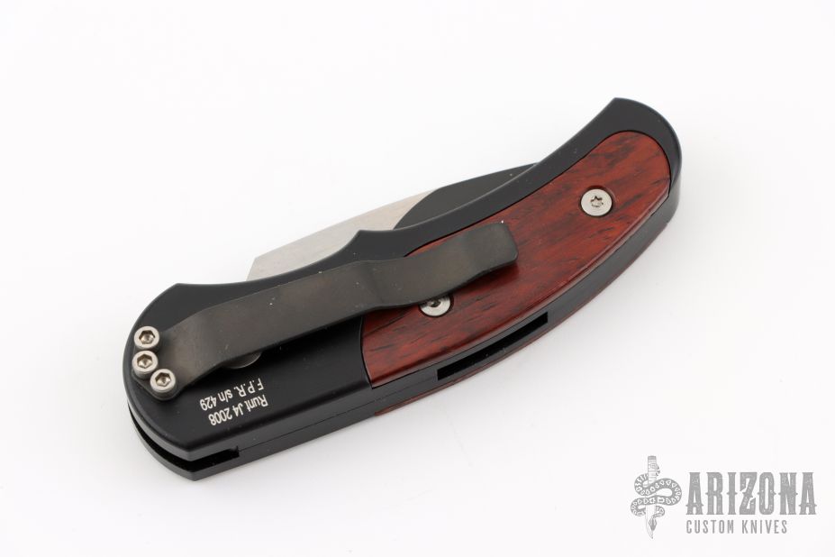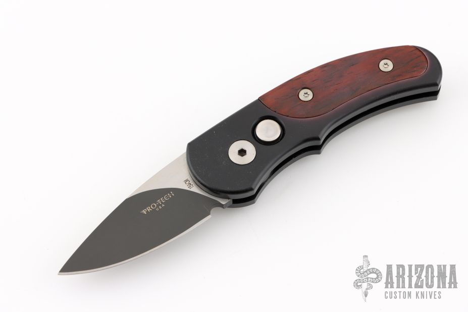 This is a Runt J4 "Jalapeno" by Pro-Tech featuring a black handle with cocobolo inlays and a two-tone blade. Coil spring. California legal. FPR and s/n 429. Excellent condition. Comes with original box and papers.