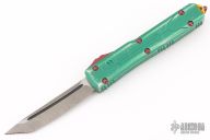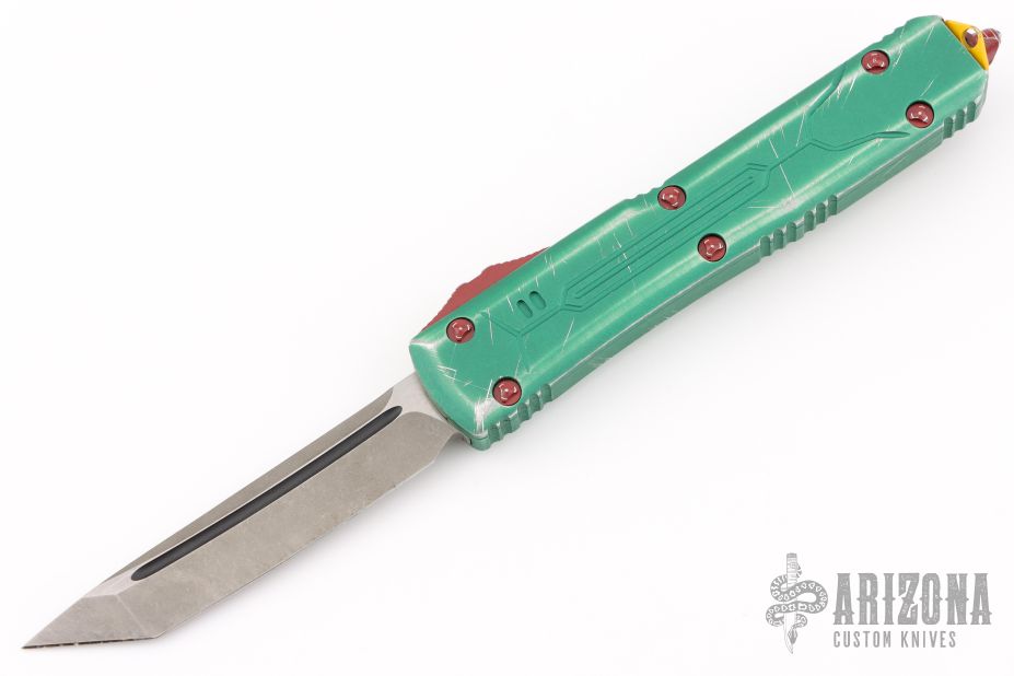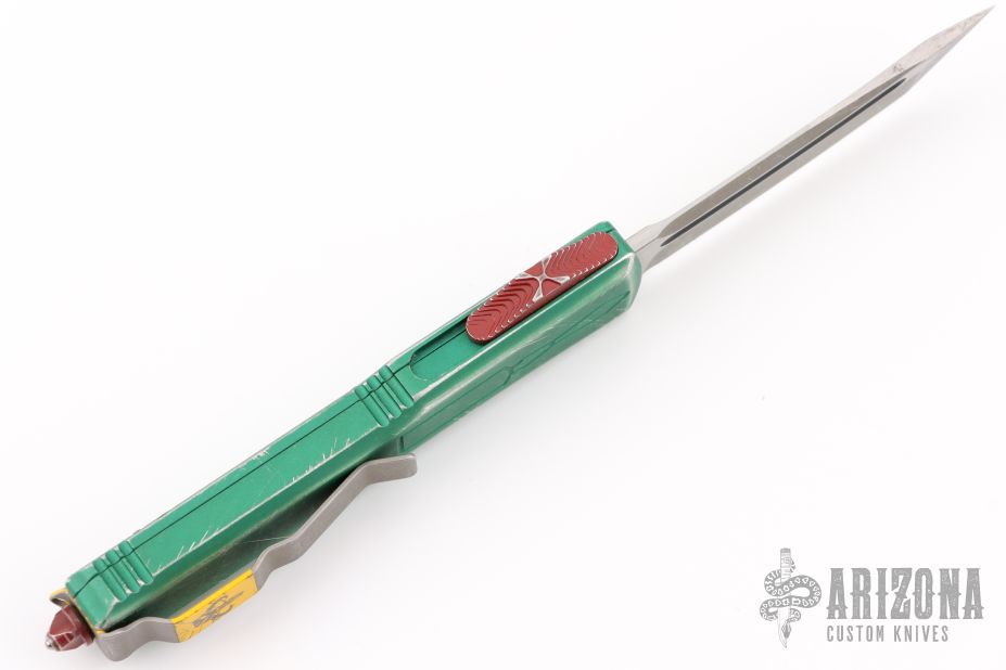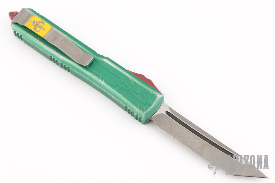 This Star Wars themed Ultratech by Microtech knives features a standard tanto blade with fullers and apocalyptic finish. The handle has a green battle worn aluminum frame with red and yellow hardware. Dated 09/2019. Excellent condition.