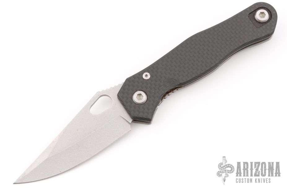 The Quartermaster Roper XL has a tumble finished blade with notched thumbrest and thumbhole. The handle has a carbon fiber and black tumbled titanium frame with black hardware and a tip up dark tumbled stainless steel clip. Rides on bearings. #098 of 300 and dated 07/15. Comes with original box, extra G10 scale, and card. Has some scuffs and scratches, good condition otherwise.