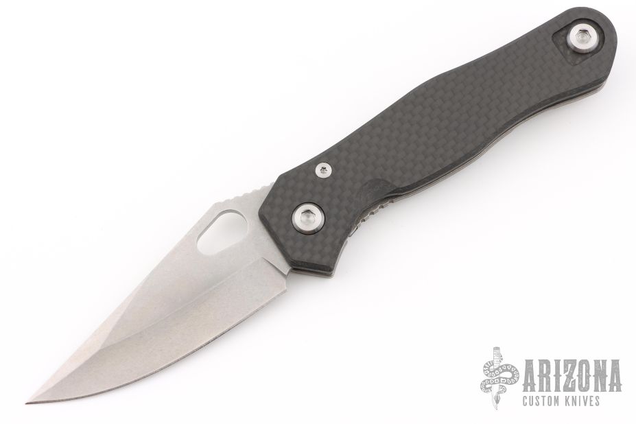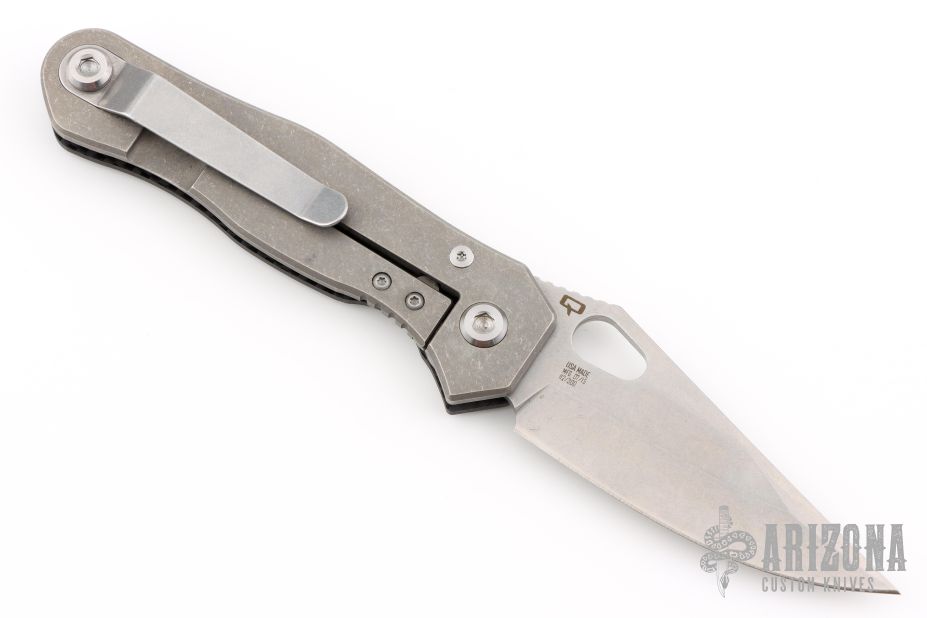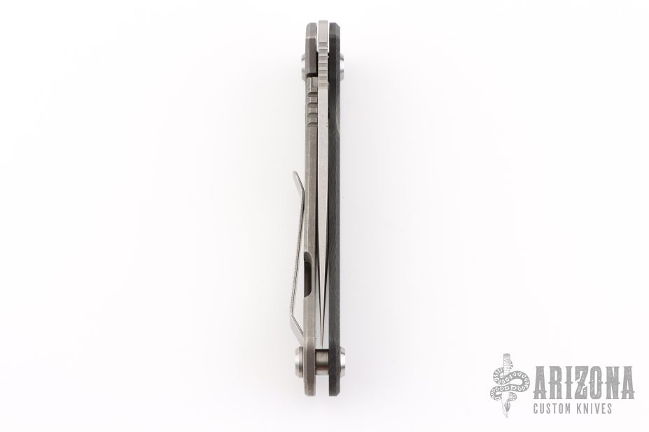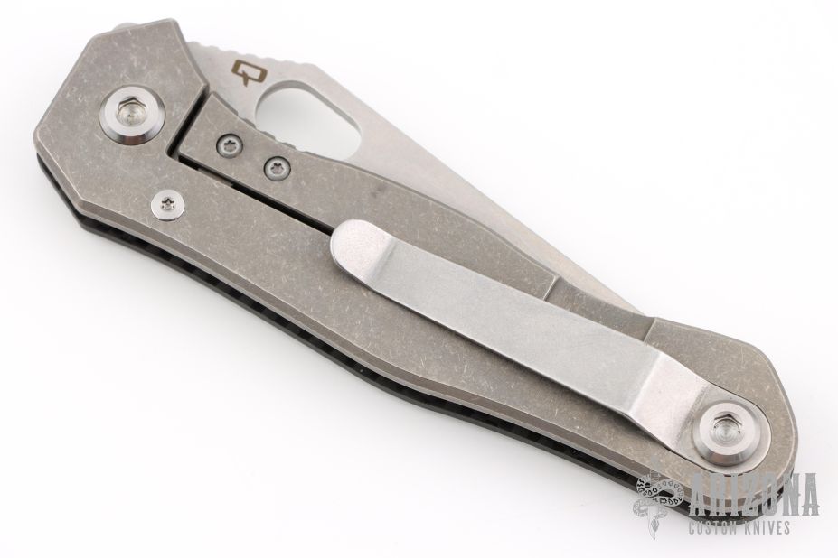 The Quartermaster Roper XL has a tumble finished blade with notched thumbrest and thumbhole. The handle has a carbon fiber and black tumbled titanium frame with black hardware and a tip up dark tumbled stainless steel clip. Rides on bearings. #112 of 300 and dated 07/15. Comes with original box, extra G10 scale, and card. Has some scuffs and scratches, good condition otherwise.