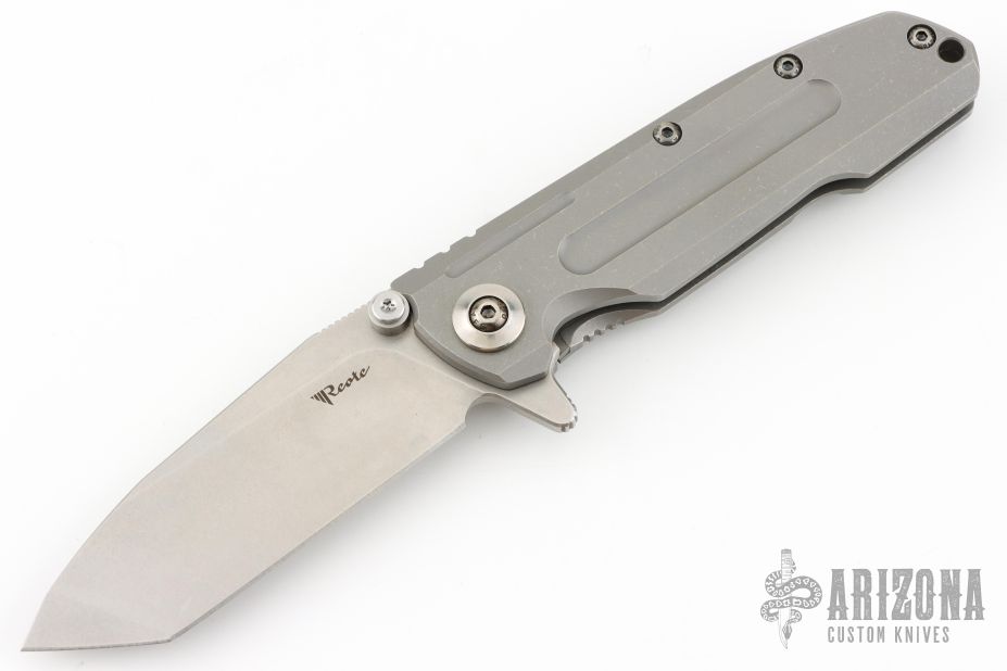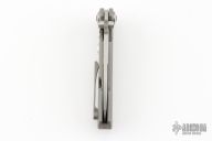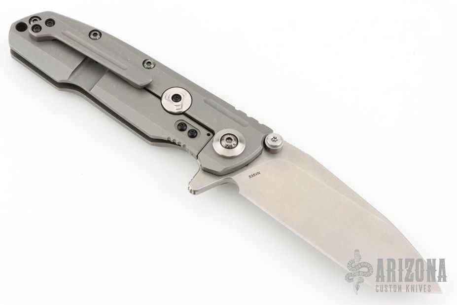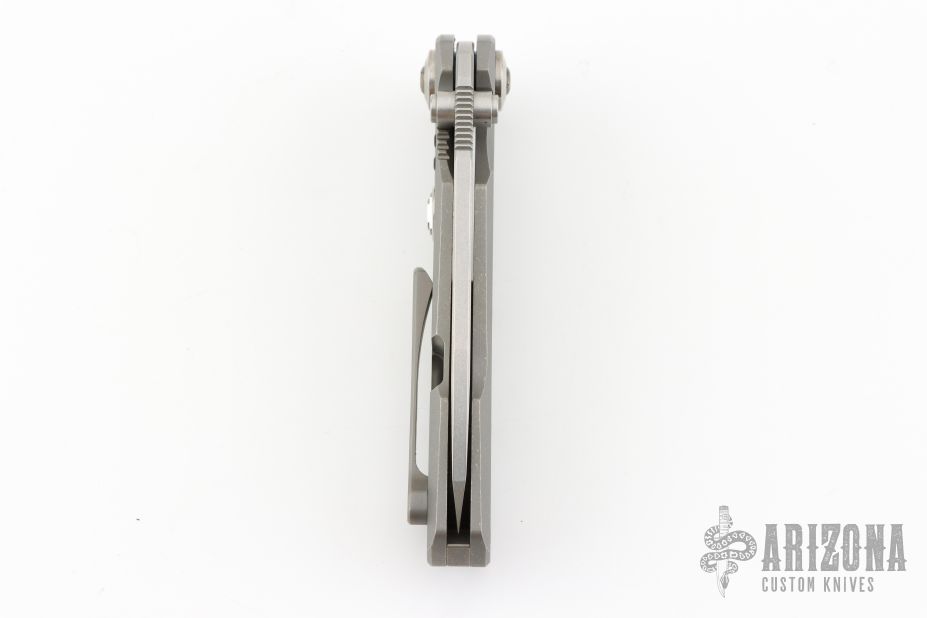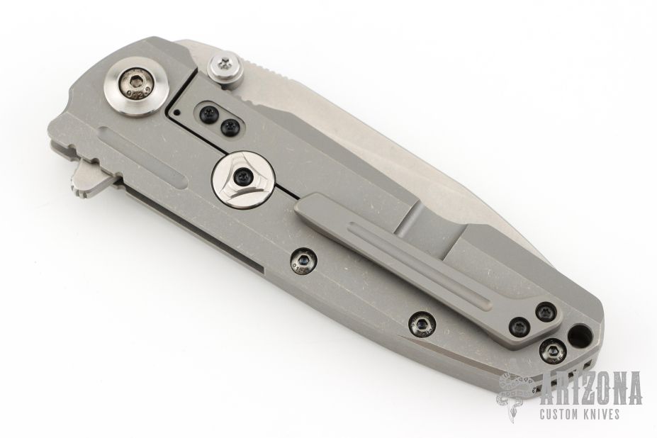 This Frame lock Flipper has a stonewashed S35VN tanto blade with dual thumb studs, flipper, and filed thumb rest. Handle is stonewashed and anodized titanium with stainless steel lock bar insert, manual lock safe system (preventing the lock bar from sliding to the open position, making this knife a virtual fixed blade), stonewashed titanium backspacer and tip up clip, and lanyard hole. This is an impressive piece with superb ergonomics and mechanics. Flips like a champ on caged bearings, dead center blade seating and rock solid lockup. Very nice work. Excellent condition. Comes with zippered case.