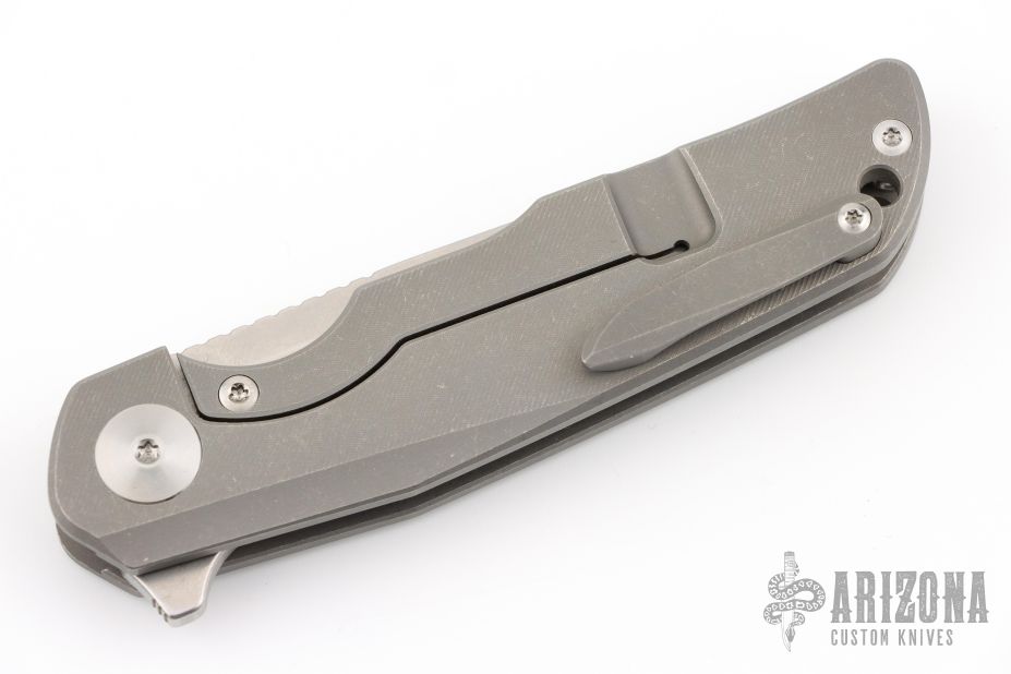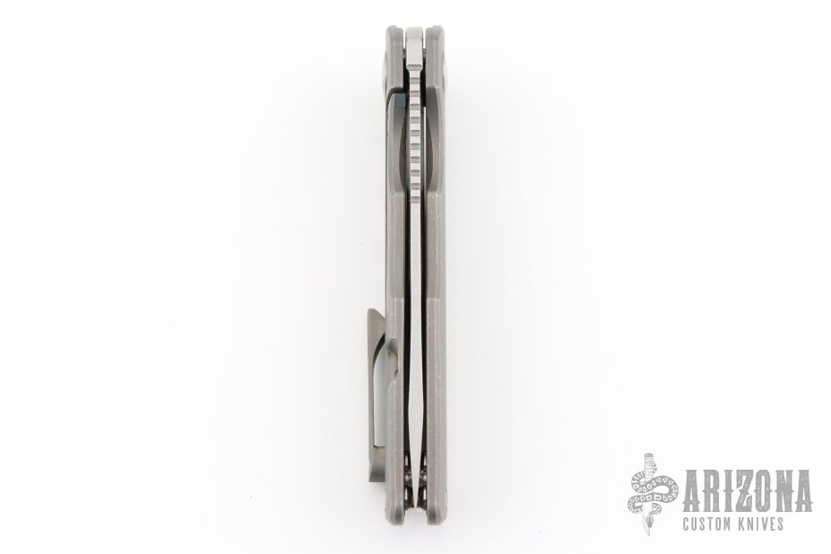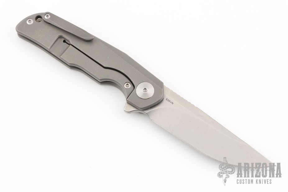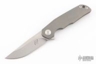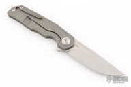 This Remedy Mid-Tech knife by Liong Mah features a stonewashed upswept blade with notched thumbrest and swedge. The handle has a stonewashed titanium frame and tip up clip. Rides on raced bearings. Nice detent, lockup and blade seating. Comes with original zipper case. Has a couple light scuffs, excellent condition otherwise.