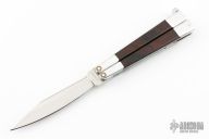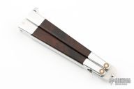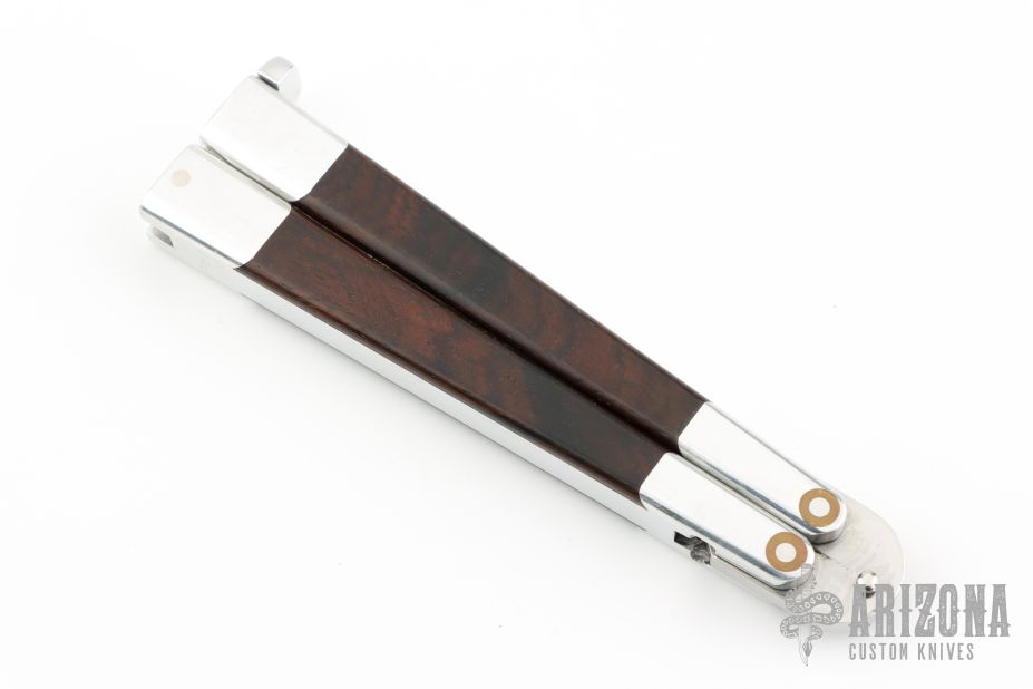 This Balisong by Walter Erickson features a mirror polished blade with a false top edge. The handle is comprised of integral aluminum handles with front/rear dovetail bolsters, wood inlaid scales and nickel silver pins. Steel T latch on pommel.  Has scuffs and scratches, otherwise good condition.