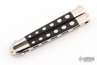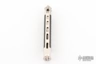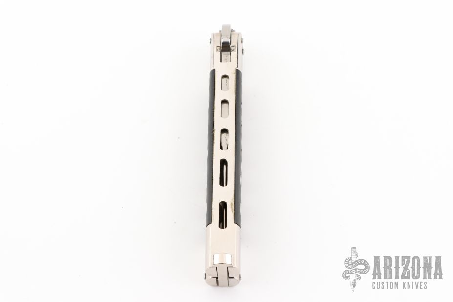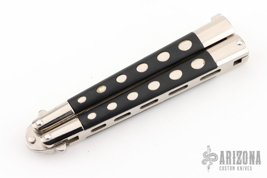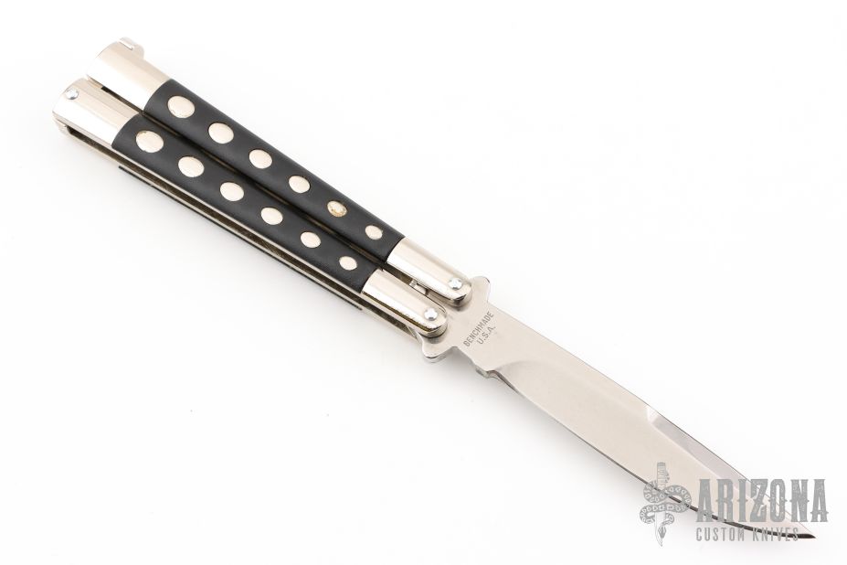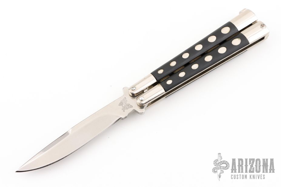 This Balisong by Benchmade features a tumbled/polished blade. The handles are zanak with black plastic inlays. Has a few light scratches, otherwise excellent condition. Comes with leather pocket sheath.