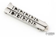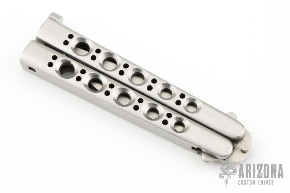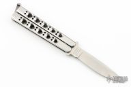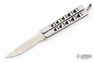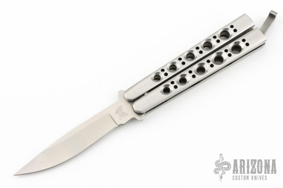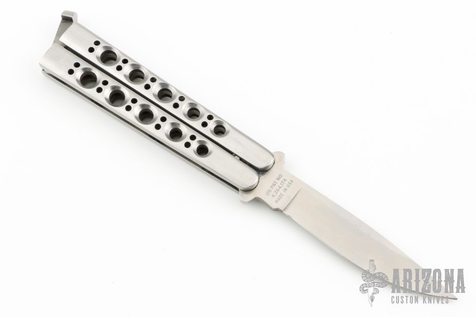 This is a Model 68 Bali-Song by Pacific Cutlery, it has a tumble polished blade with a false top edge. The handles are stainless steel with a T-latch. Comes with original nylon sheath, box, and papers. Has some light scratches, otherwise excellent condition. Tip is blunted slightly.
