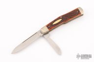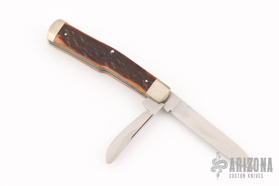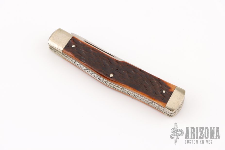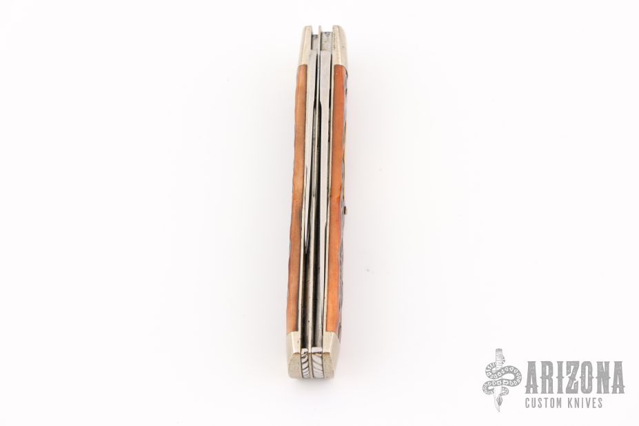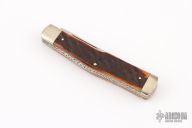 This Bent Gunstock by Tomonari Hamada features hand rub satin finished blades with nail nicks. The handle has nickel-silver bolsters and liners with jigged bone covers and a gold escutcheon. Fileworked back springs.   Centered blades. . Excellent condition.