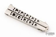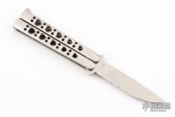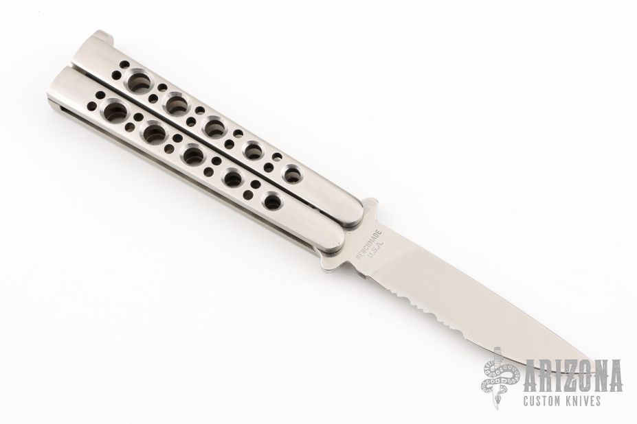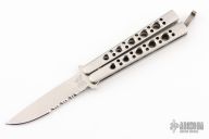 This vintage Model 35S Balisong from Benchmade features a polished drop point blade with partial serrations . The handle is comprised of integral steel construction. T latch on pommel. Comes in original nylon belt sheath. Has light scratches, excellent condition otherwise.