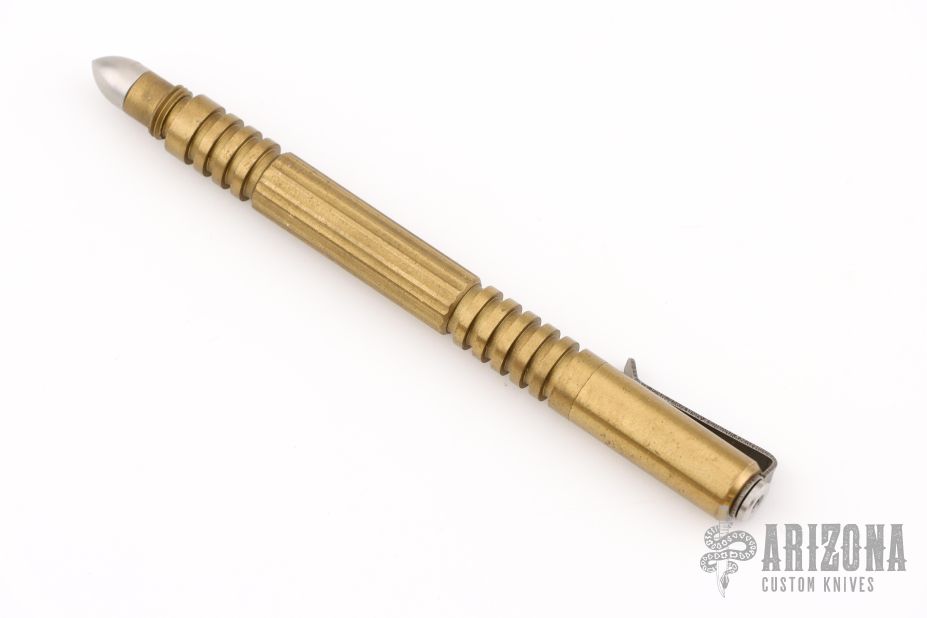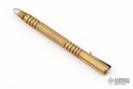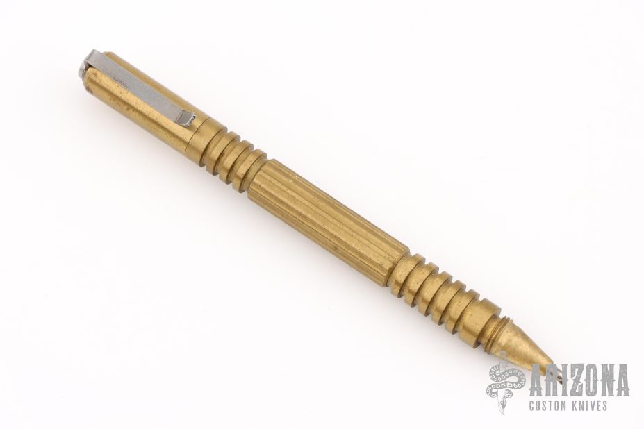 Compact brass tactical pen designed for both writing and self-defense. Features deep end grooves, longitudinal grip lines, and a modular design compatible with attachments like the warhead or strike bezel. Precision CNC-machined with coarse, durable threads and built to handle heavy strikes. Uses Fisher Space Pen SPR4B refills.