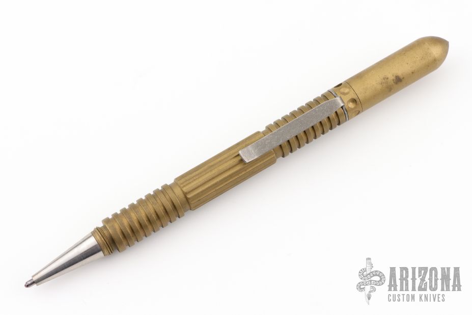 Brass Battlefield Pickup edition Modular Kubaton Pen. Precision CNC/CAD-CAM construction with textured body for a secure grip. Modular design allows quick attachment changes for use as a functional pen or kubaton. Has some scuffs/scratches otherwise good condition.