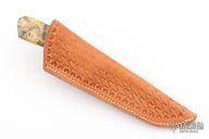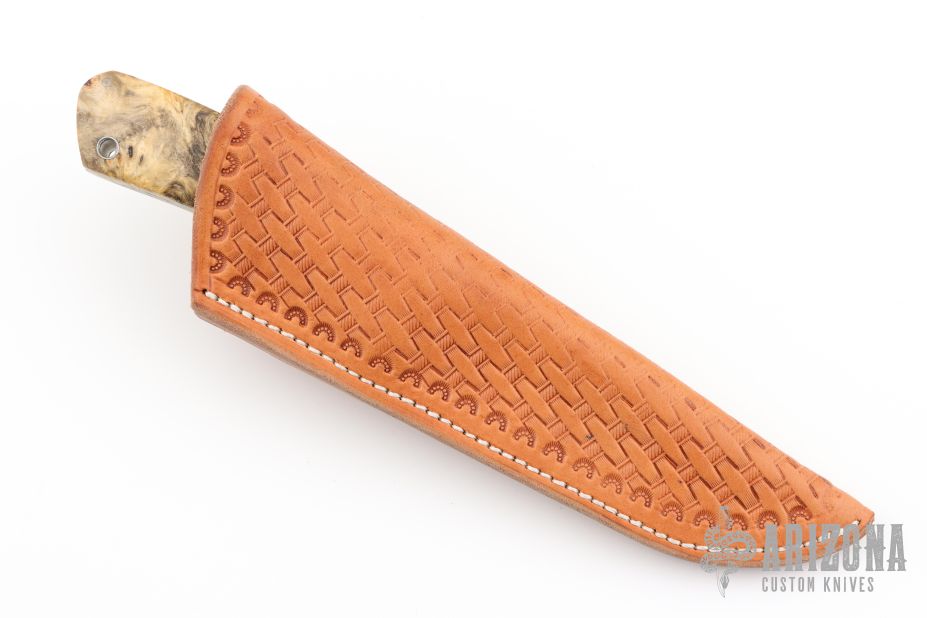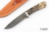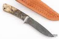 This knife by Michael E. Miller features a Damascus drop point blade with a tapered tang construction.  .173" Blade Stock. 1.099" Blade Depth.  The handle features a steel guard and buckeye burl grip.  Includes a brown hand tooled leather sheath and Maker's card. New from maker!