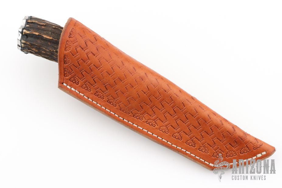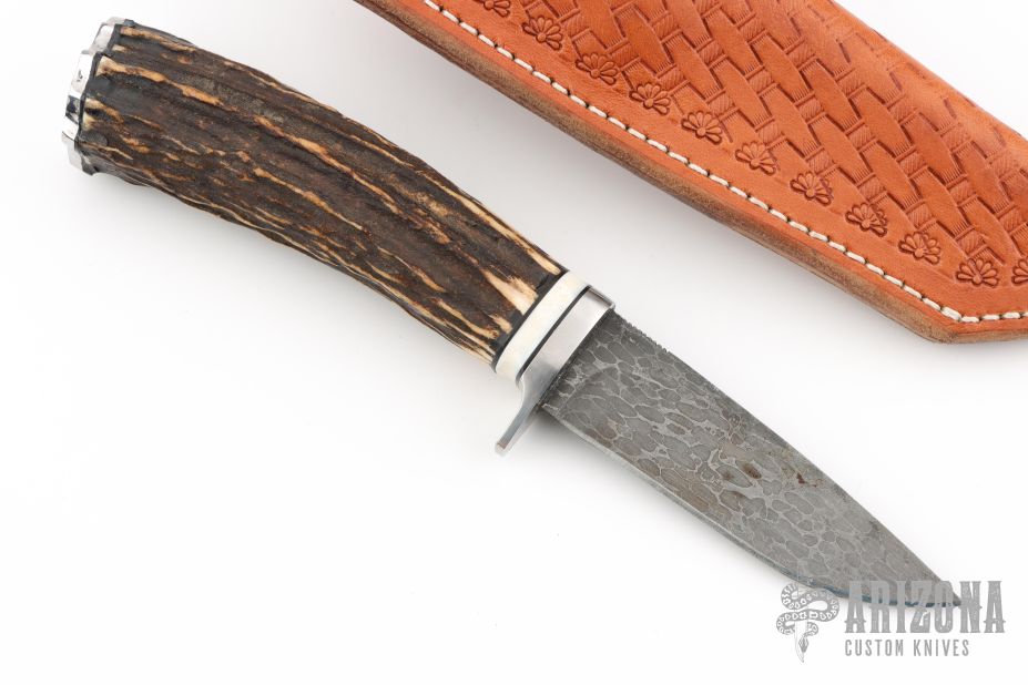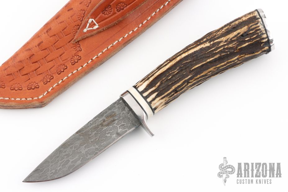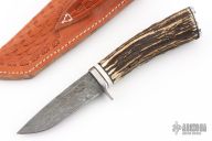 This knife by Michael E. Miller features a Damascus drop point blade with a hidden tang construction.  .144" Blade Stock. .966" Blade Depth.  The handle features a steel guard, mammoth ivory spacer, and Sambar stag grip with stainless butt-cap.  Includes a brown hand tooled leather sheath and Maker's card. New from maker!