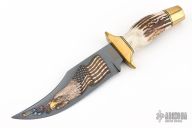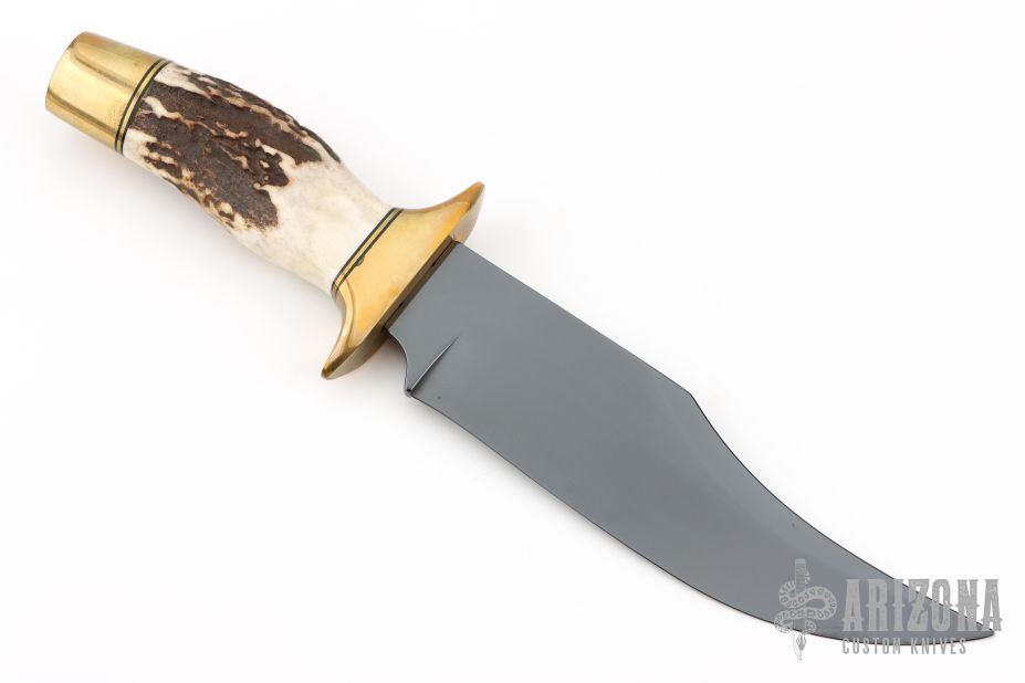 This Bowie by Schrade features a gun blued blade with false top edge, .186" blade stock and 1.650" blade depth, hidden tang construction. The handle has a brass guard and pommel, stag grip with black and brass spacers. Includes a padded zippered case.  Excellent condition.