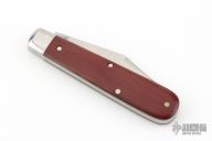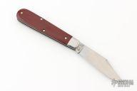 This slipjoint by Great Eastern Cutlery features a satin finished clip point blade with a single nail nick. The handle has stainless bolsters, red linen micarta covers, stainless steel liners and spring. Has half stop. Comes with original tube and paper. Has a couple light scratches, otherwise Excellent condition. 243 made