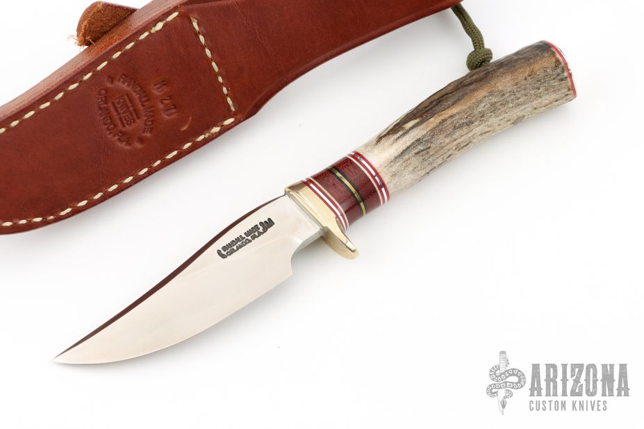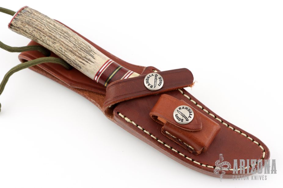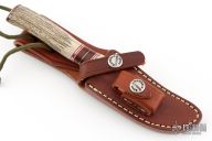 This Miniature Model 27 Hunter by Randall features a satin finished blade with false top edge, .188" blade stock and 1.038" blade depth, hidden tang construction. The handle has a brass guard and butt, and stag grip with red/white/black spacers. Comes with a brown leather sheath. Excellent Condition.