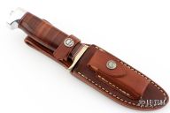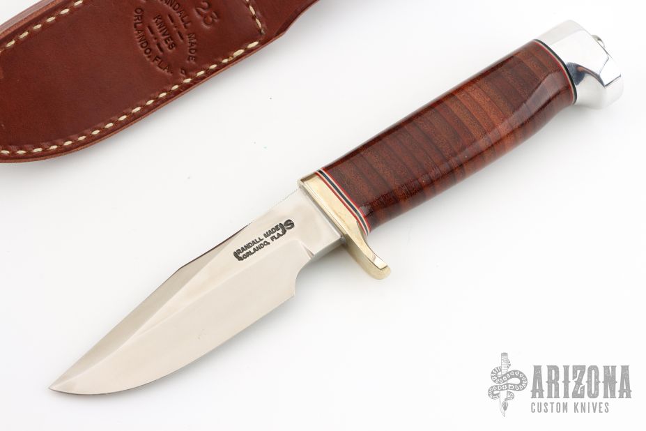 This Model 23 "Gamemaster" by Randall Made Knives features a satin finished clip point blade with sharpened top edge and a notched thumbrest, .203" blade stock and 1.297" blade depth hidden tang construction. The handle has a nickel silver guard and duralumin butt with a stacked leather grip with red/white/blue spacers. Comes with original brown leather sheath. Excellent condition.