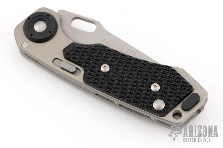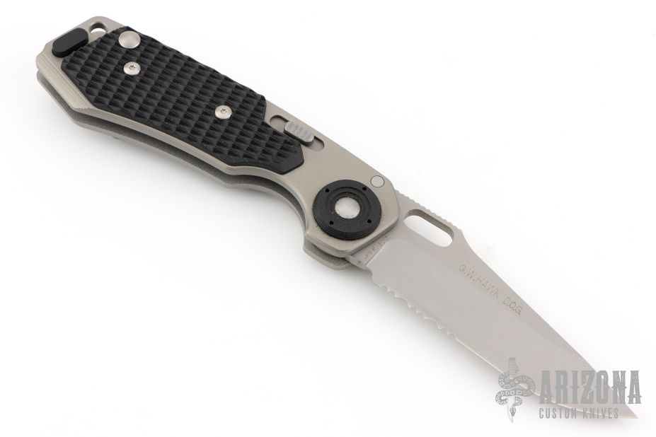 This HAWK D.O.G. is a Grant & Gavin Hawk design that incorporates their Deadbolt Over Grabstep locking mechanism. It's an easy to use knife with smooth action using the thumb hole. The CRKT HAWK DOG has a bead blasted partially serrated clip point style blade and T6 aluminum handles with Zytel scales.  Includes the original box and papers.  Excellent Condition.