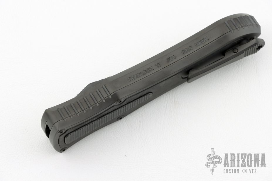 This Limited Edition Box Set by Grant and Gavin Hawk is #243 of 500. It comes with a Deadlock Model C, TTI JW2 Pencil, and 2 gold coins. It has a double-edged black blade. The handle has a Carbon Fiber inlays in the DLC titanium frame with a tip down spring clip, titanium. The thumb slide on the handle is also titanium and handle has a titanium overlay. Grant and Gavin Hawk set out to create a double action OTF with no blade play.... They did it, NO blade play. New condition.