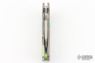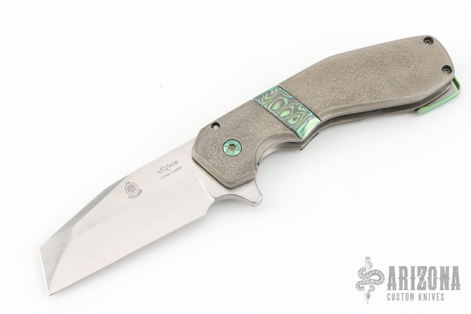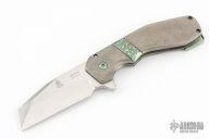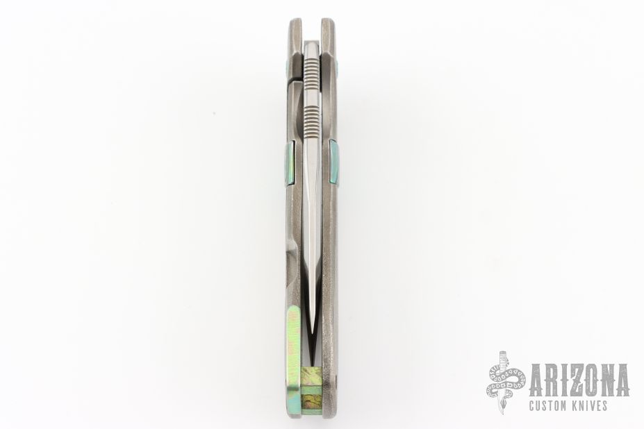 This Razel from Jon Graham features a satin finish blade with notched flipper tab, notched and crowned blade spine. Sharpened front edge. The handle is comprised of textured titanium frame with a Timascus overlays, Timascus standoffs, and anodized titanium pocket clip for tip up carry. Dimpled and anodized pivot. Blade favors the right side slightly. Nice action and detent. Excellent condition.