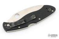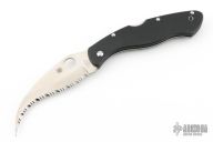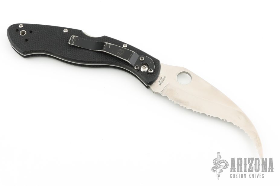 This Civilian Lockback Folder by Spyderco has a satin finished, fully serrated hawkbill blade with thumb hole. Handle is black G-10 with stainless steel (single) liner, stainless steel backspacer/ lock, and tip up/ down 2-way reversible RH black stainless steel clip. Comes in a tube. Has scratches on the clip and some scuffs on the frame. Great condition otherwise.