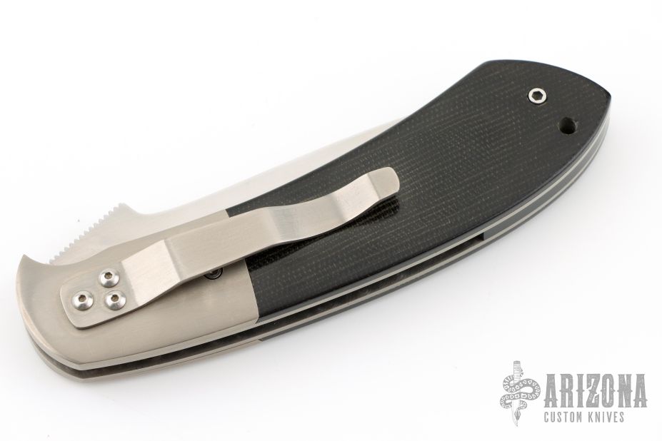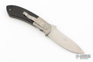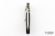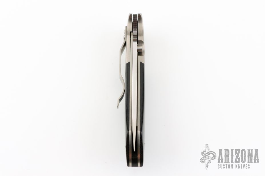This Linerlock Folder from Keith Coleman features a hand rub satin finished blade with knurled single thumb stud and notched thumb ramp. The handle is comprised satin bolsters, black G10 scales over titanium liners and black G10 backpsacer. Stainless steel tip down clip. Has a couple light scuffs and scratches, great condition otherwise.