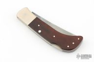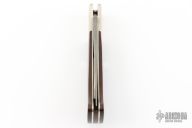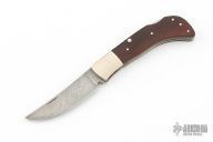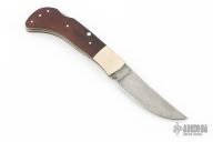 This Lockback by Bill King features a Damascus clip point blade with nail nick. The handle has nickel silver dovetail bolsters, wood scales, nickel silver liners and steel rockerbar. #0382 on the blade, Comes in a soft pouch. Has some light scratches and patina, otherwise excellent condition.