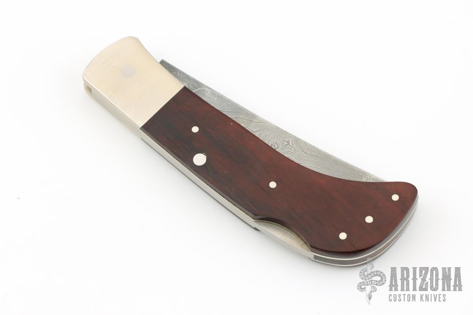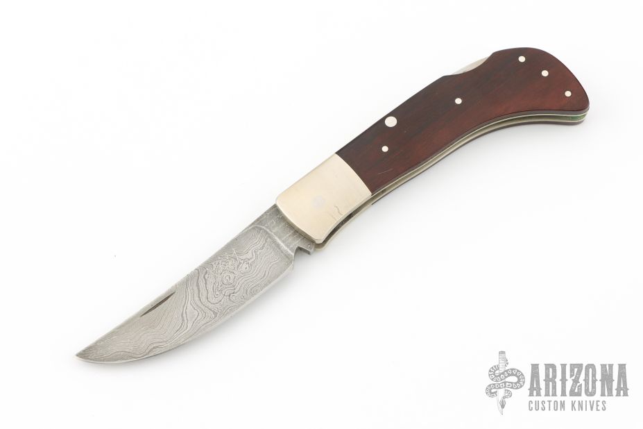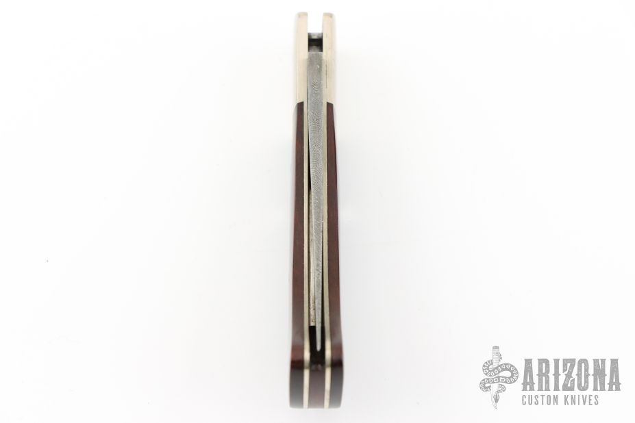 This Lockback by Bill King features a Damascus clip point blade with nail nick. The handle has nickel silver dovetail bolsters, wood scales, nickel silver liners and steel rockerbar. #0382 on the blade, Comes in a soft pouch. Has some light scratches and patina, otherwise excellent condition.