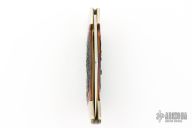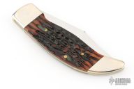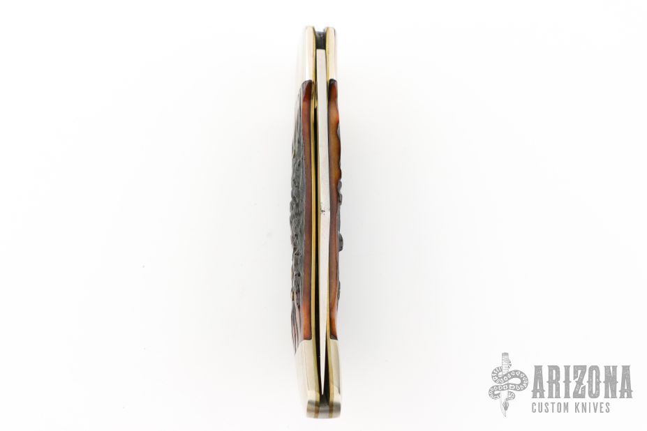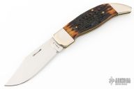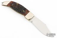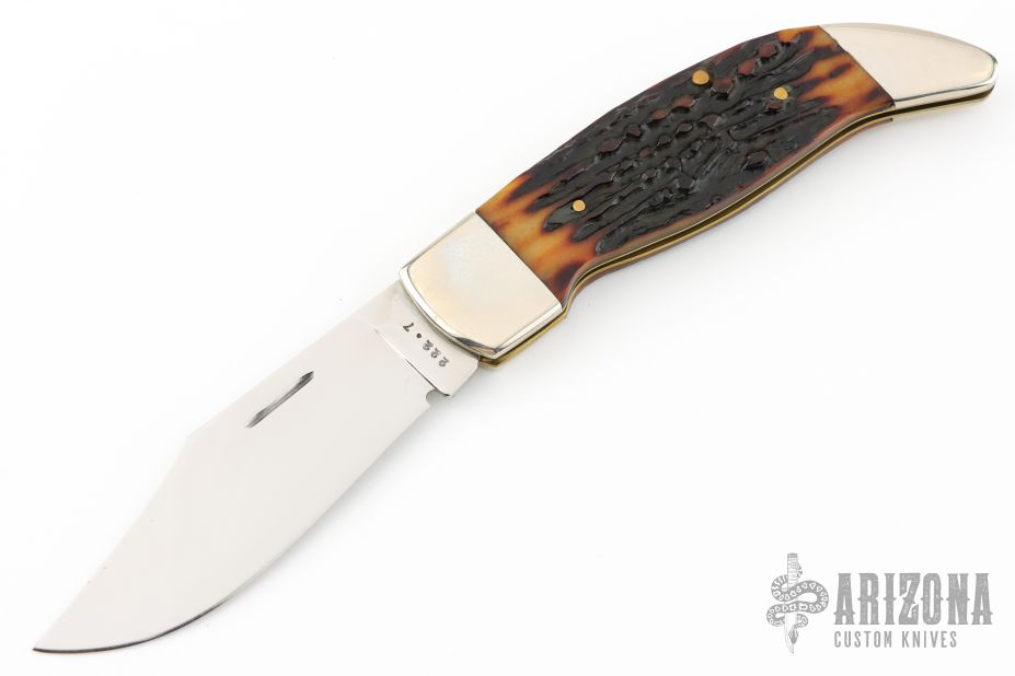 This knife by Steve Voorhis features a mirror polished blade with nail nick. The handle has nickel silver bolsters, stag covers with brass liners and a fileworked stainless steel spring. Has some light scratches, otherwise excellent condition. Comes with a Marbles zippered case.