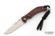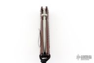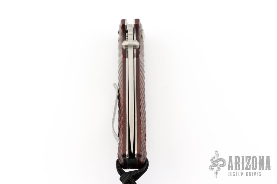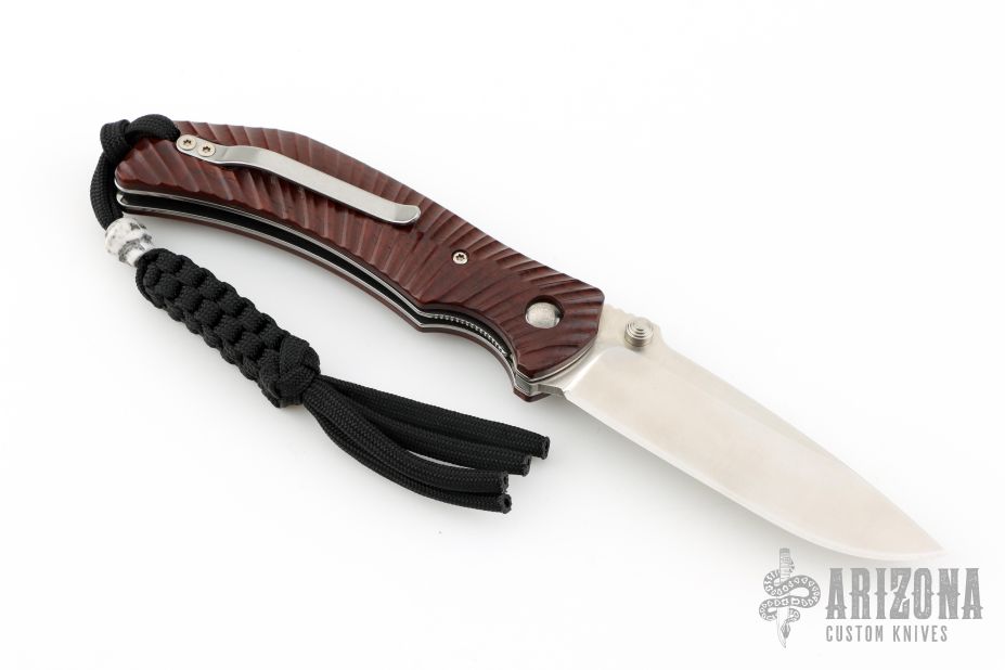 This knife features a satin/polished drop point blade with notched thumb ramp and dual thumbstuds. The handle has milled cocobolo scales and polished stainless frame with matching tip up clip, black G-10 backspacer, lanyard hole. Comes with original zipper case. Rides on washers, nice detent, lockup and blade seating. Has some light scuffs, excellent condition.