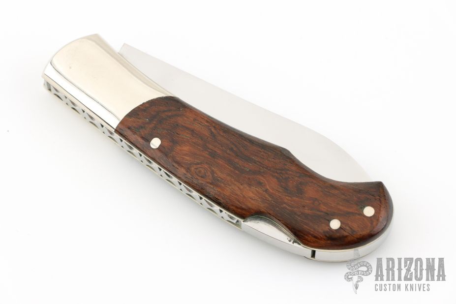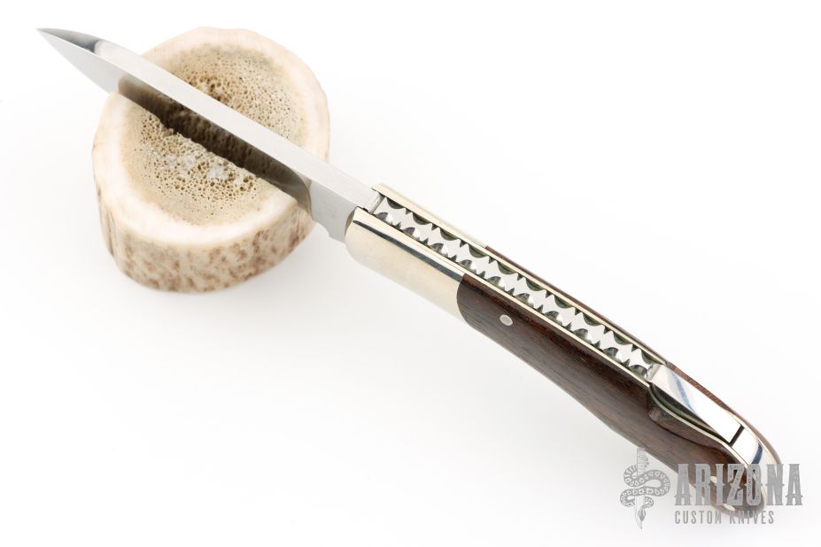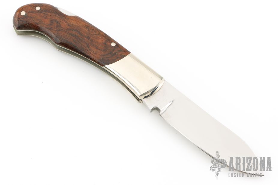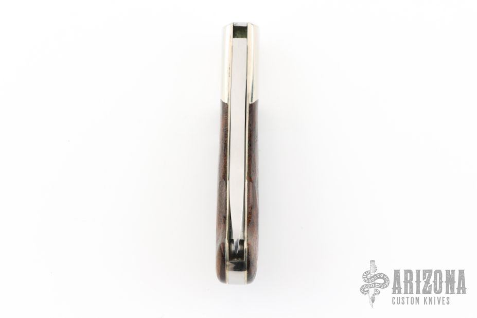 This Lockback by Ken Steigerwalt features a mirror polished blade with full face hollow grind. The handle has dovetailed nickel silver bolsters, wood scales, nickel silver liners, fileworked stainless steel backspacer. Comes in a soft pouch. Has some light scuffs and scratches, excellent condition otherwise.