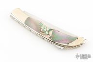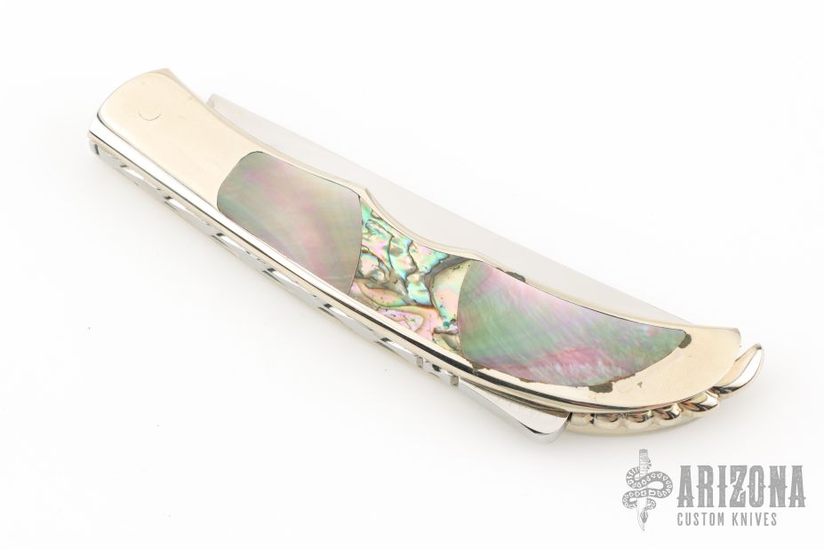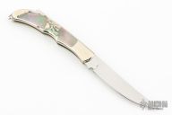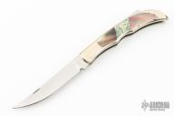 This Lockback by Ken Steigerwalt features a mirror polished blade with nail nick. The handle has nickel silver frame with black lip, mother of pearl, and abalone inlays with fileworked stainless steel backspacer. Comes in a soft pouch. Has some light scuffs and scratches, excellent condition otherwise.