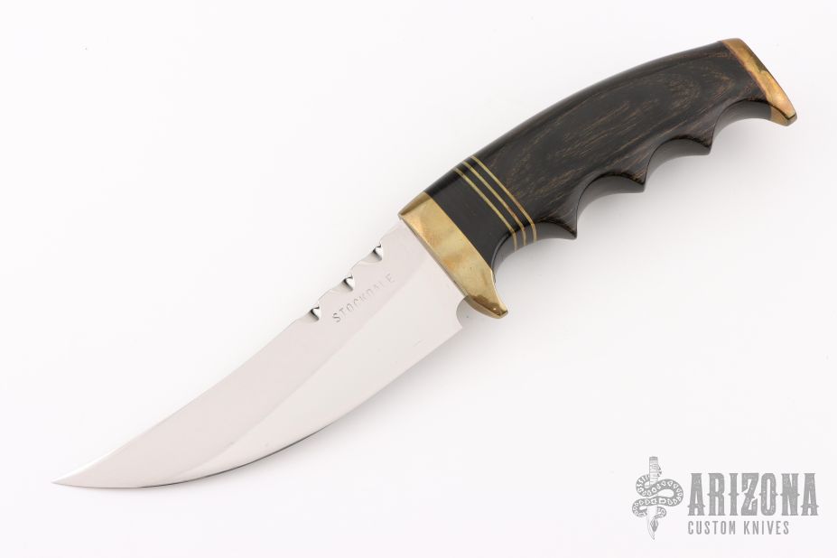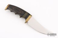 This Finger Grip Hunter by Walter Stockdale features a mirror polished trailing point blade with filework on the spine. 0.130" blade stock and 1.398" blade depth, hidden tang construction. The handle is comprised of a brass guard, spacers, wood grip and brass pommel. Comes in a zipper case. Has some scratches, and patina. Great condition otherwise.