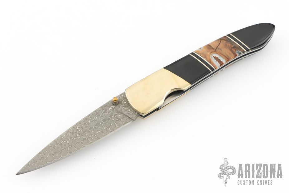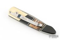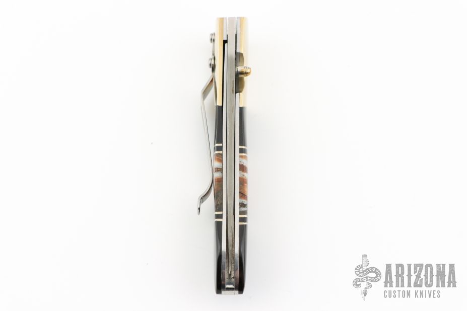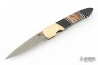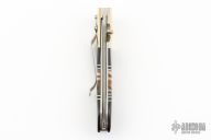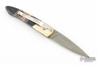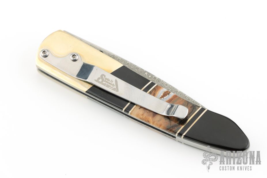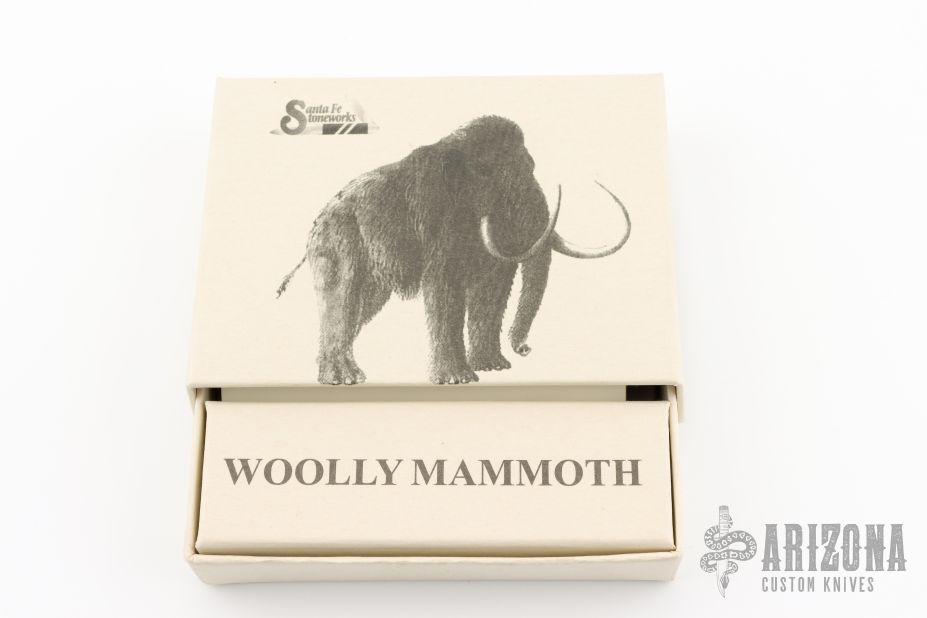 This knife by Santa Fe Stoneworks features a Damascus drop point blade with single thumbstud. The handle has nickel silver bolsters, mammoth molar scales and spacers.  Stainless steel liners, backspacer and tip down pocket clip.  Includes the original box and papers. Has a couple light scratches, otherwise Excellent condition.
