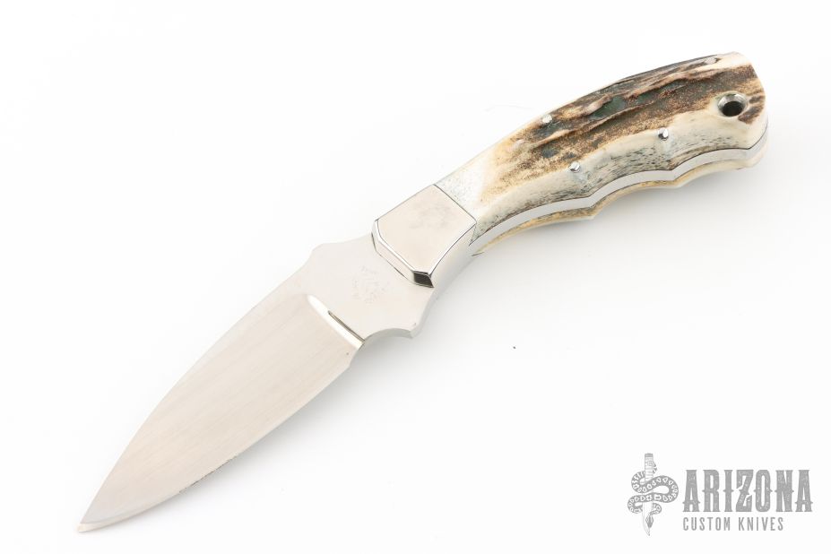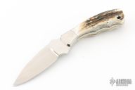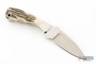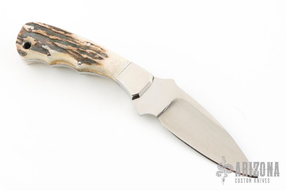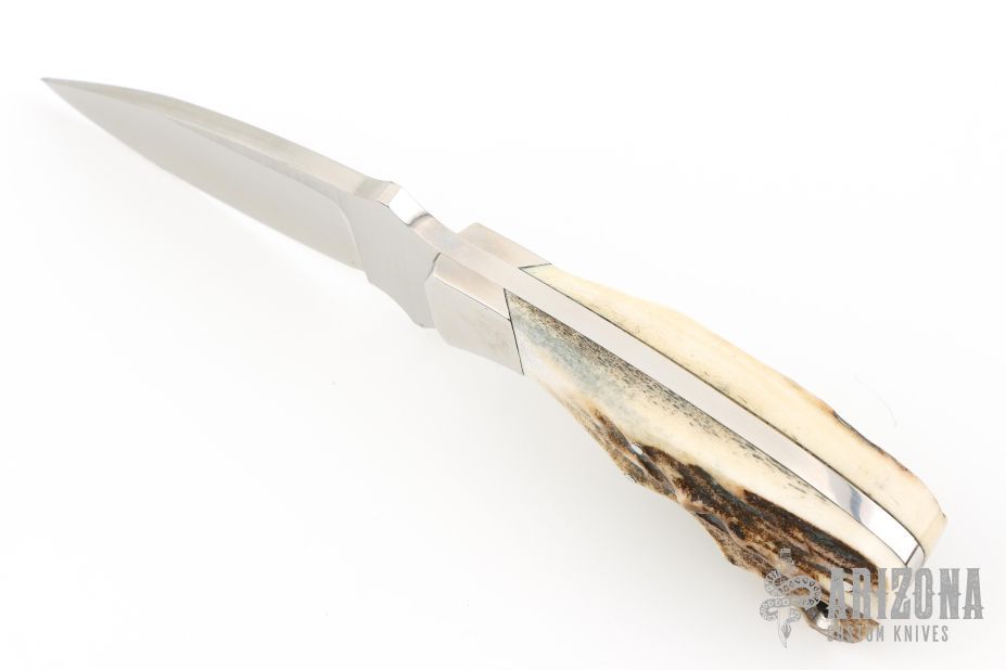 This hunter by Larry Harley features a hand rub satin finished blade with .186" blade stock and 1.116" blade depth, full tang construction. The handle has pinned nickel silver dovetail bolsters with stag covers and lanyard hole in pommel. Comes in a zipper case. Has some light scuffs, excellent condition otherwise.