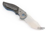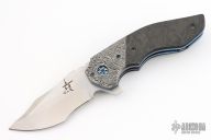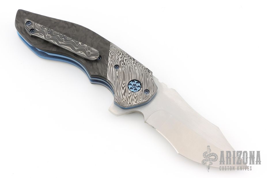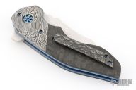 This Empire Flipper by Greg Lightfoot features a satin finished tanto recurve blade with swedge, notched thumbrest and a flipper. The handle has Damascus bolsters, marble carbon fiber scales, anodized titanium liners and barrel spacers, tip up Damascus clip, anodized hardware. Comes with COA dated 2018. Rides on bearings, nice detent, lockup and blade seating. Excellent condition.