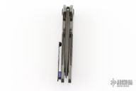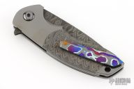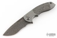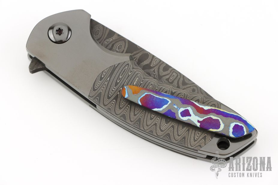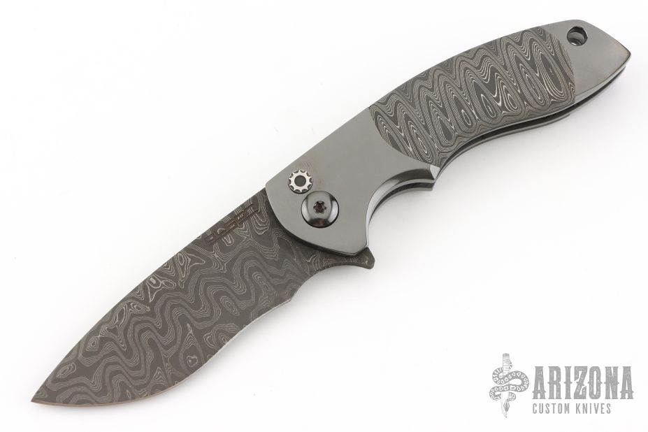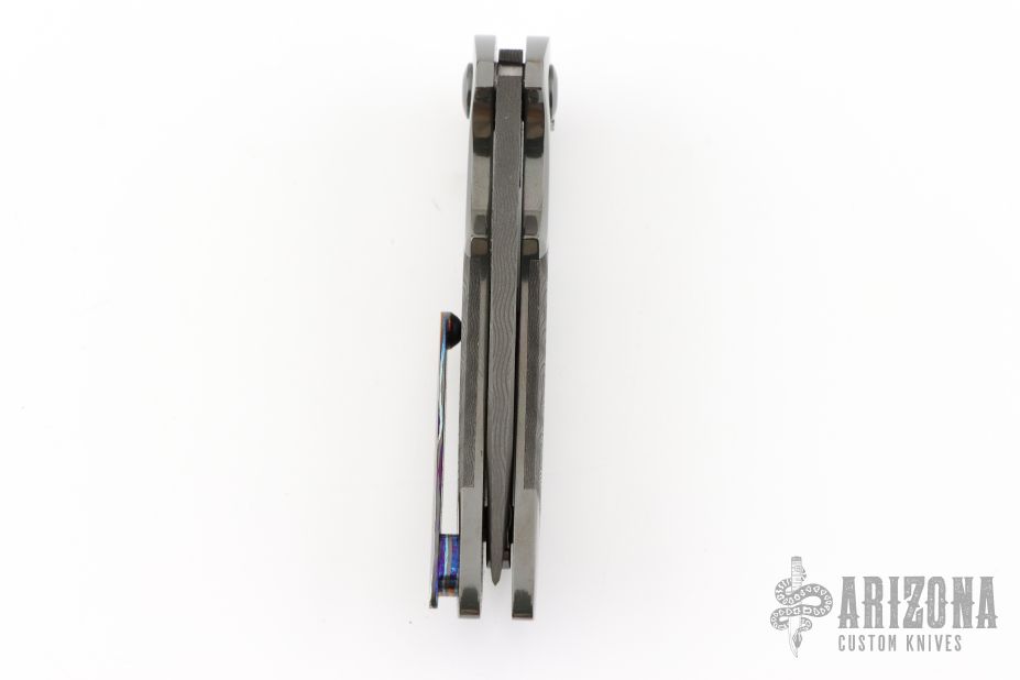 This JV Gemini 3 by Rod Olson features a darkend Damascus recurve blade with flipper. The handle has a polished zirconium frame with Damascus inlays, floating zirconium backspacer, tip up MokuTi clip with hidden hardware. Very well done. Rides on bearings, nice detent, lockup and blade seating. Has a couple light scratches, excellent condition otherwise.